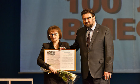 Главный редактор газеты Ирина Марченкова вручила Юрию Лодкину памятную медаль «К 100-летию «Брянского рабочего».