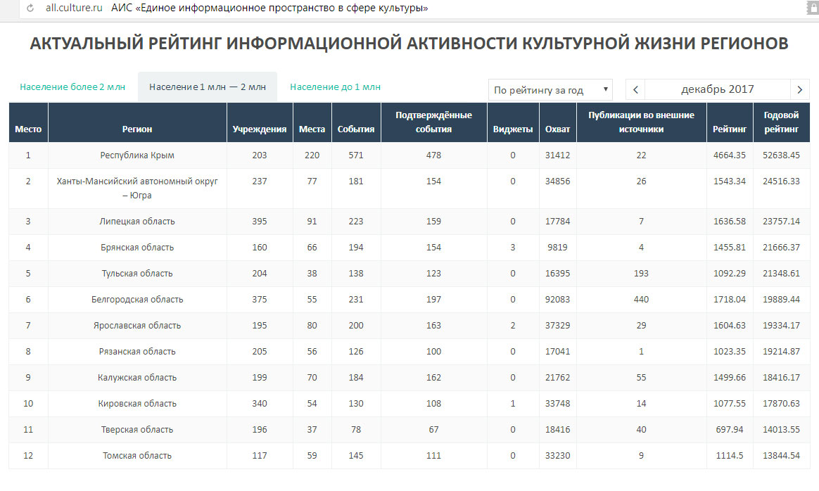 Активность учреждений культуры по распространению информации о культурных мероприятиях фиксируется с помощью рейтинга информационной активности культурной жизни регионов.