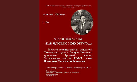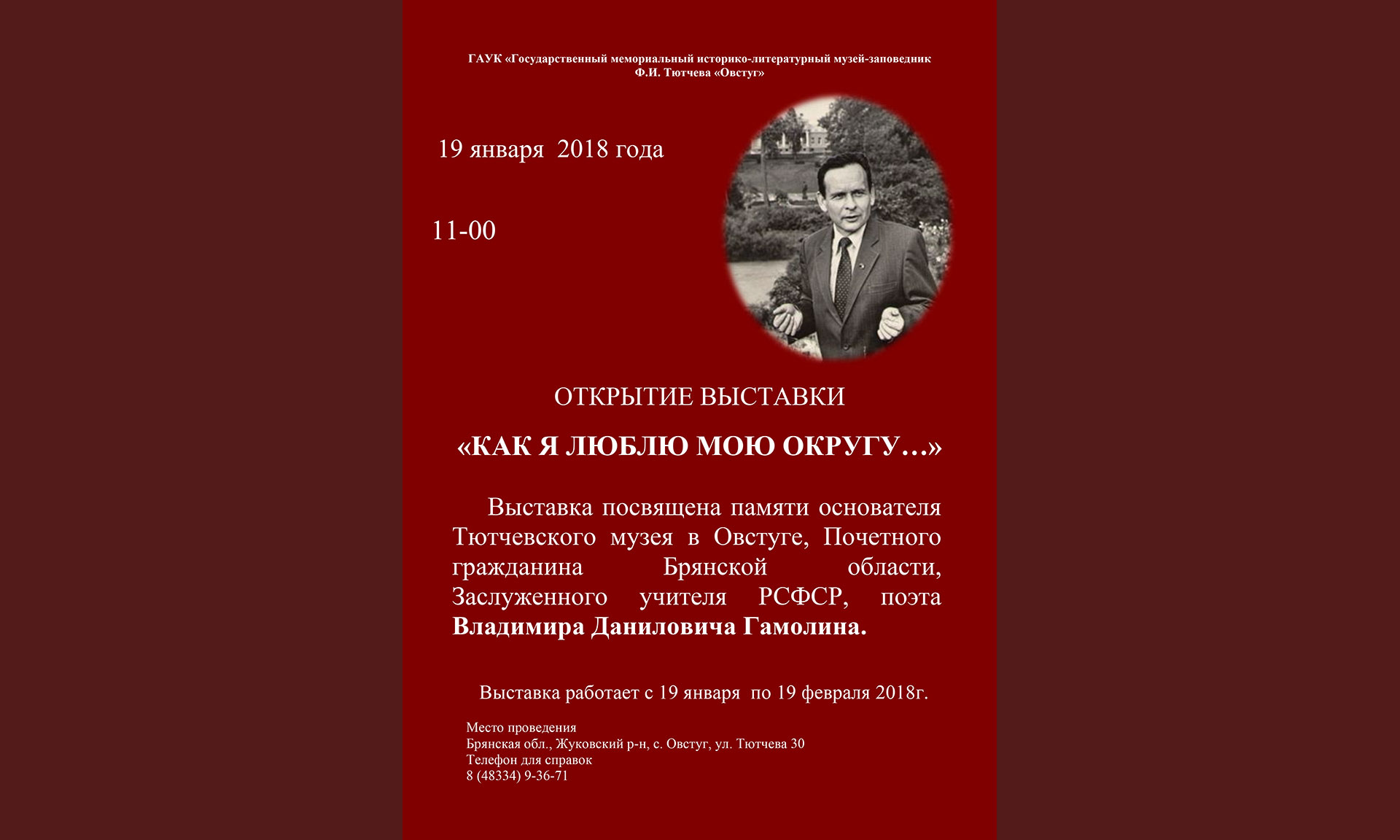 19 января 2018 года в музее-заповеднике Ф. И. Тютчева «Овстуг» пройдет открытие выставки живописных картин брянских художников: Владимира Волкова, Лидия Кузнецовой-Лаворько, Юрия Махотина, Василия Лаворько, Сергея и Алексея Ткачевых, посвященной памяти Владимира Гамолина «Как я люблю мою округу…». Выставка демонстрирует портреты Гамолина и окрестности села Овстуг.