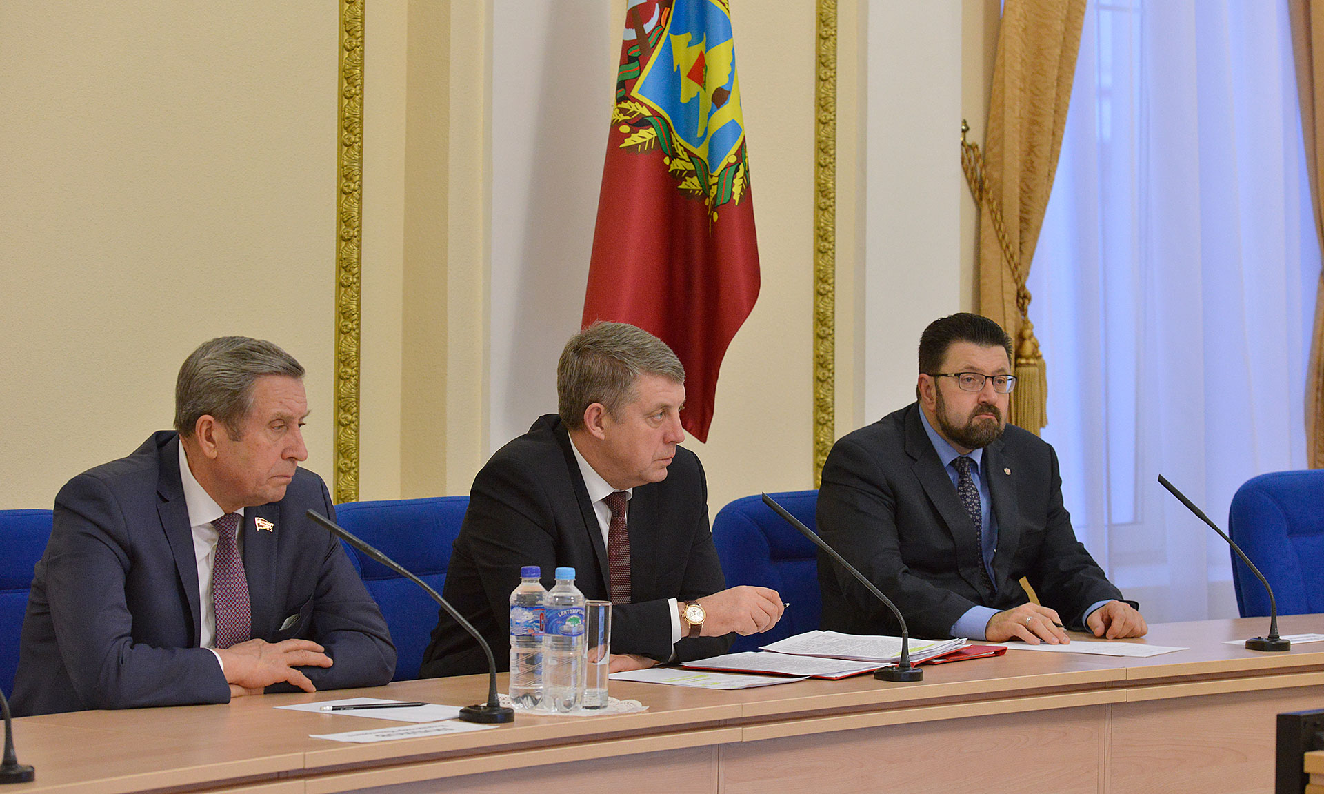 В совещании приняли участие Губернатор Александр Богомаз, председатель Брянской областной Думы Владимир Попков, федеральный инспектор по Брянской области Михаил Калашников, члены Правительства Брянской области.