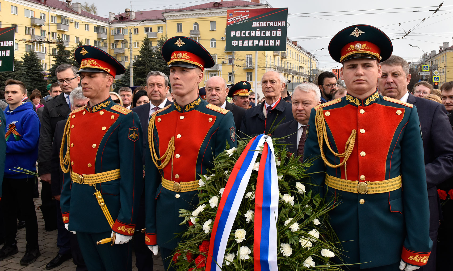 В церемонии возложения цветов и венков приняли участие начальник Управления Президента Российской Федерации по межрегиональным и культурным связям с зарубежными странами Владимир Чернов, специальный представитель Президента Российской Федерации по международному культурному сотрудничеству, сопредседатель Правления Межгосударственного фонда гуманитарного сотрудничества государств-участников СНГ Михаил Швыдкой, народный артист СССР, сопредседатель Общероссийского гражданско-патриотического движения «Бессмертный полк» Василий Лановой, ветеран Великой Отечественной войны Валериан Кацитадзе, внучки И. В. Панфилова Алуа Байкадамова и Айгуль Байкадамова, Губернатор Брянской области Александр Богомаз, председатель Брянской областной Думы Владимир Попков, депутаты Государственной Думы Федерального собрания Российской Федерации Валентина Миронова и Борис Пайкин, главный федеральный инспектор по Брянской области Афанасий Киселев, федеральный инспектор по Брянской области Михаил Калашников и другие официальные лица.