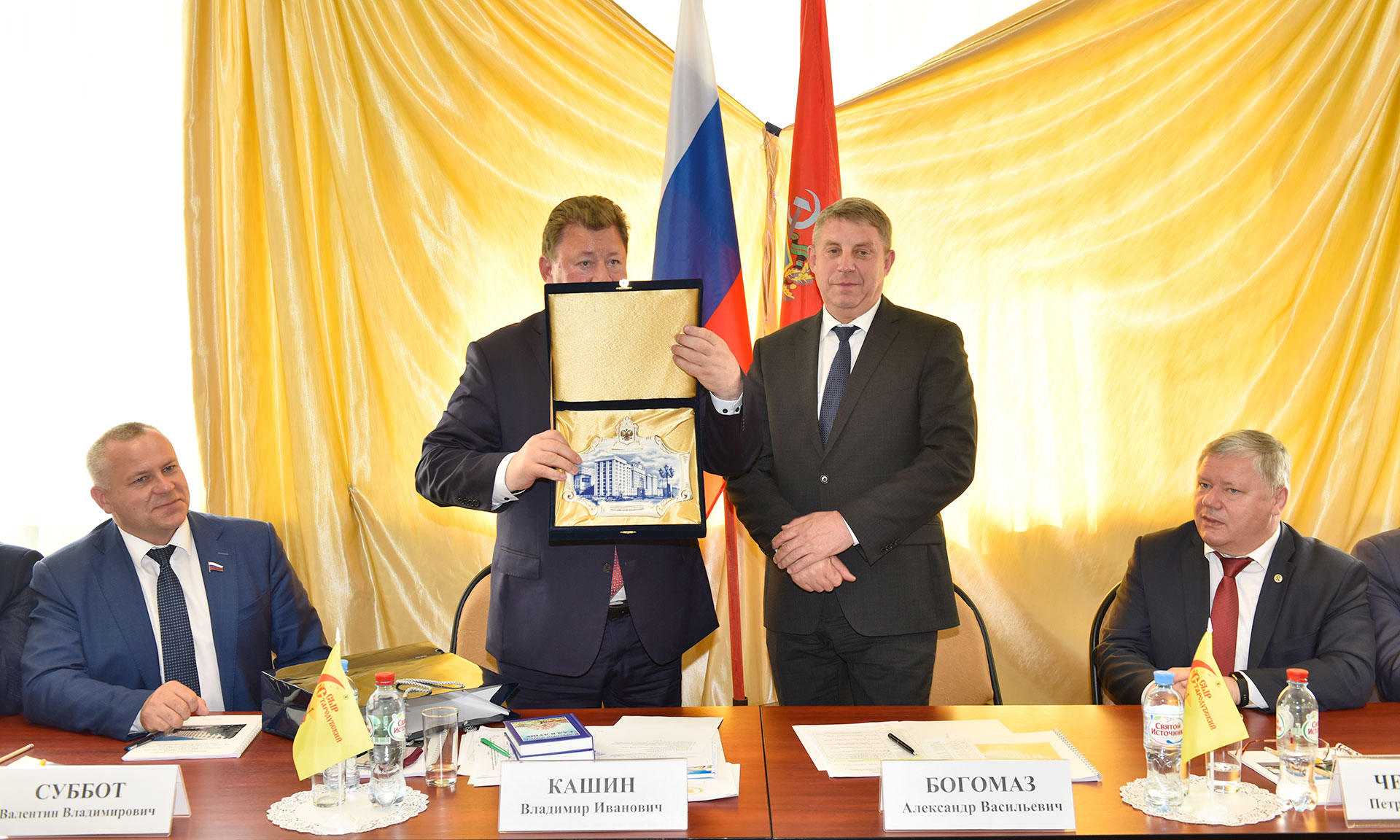 Владимир Кашин вручил памятные сувениры Губернатору Брянской области Александру Богомазу, председателю Брянской областной Думы Владимиру Попкову, уполномоченному ТнВ «Сыр Стародубский» Александре Мокроусовой.