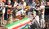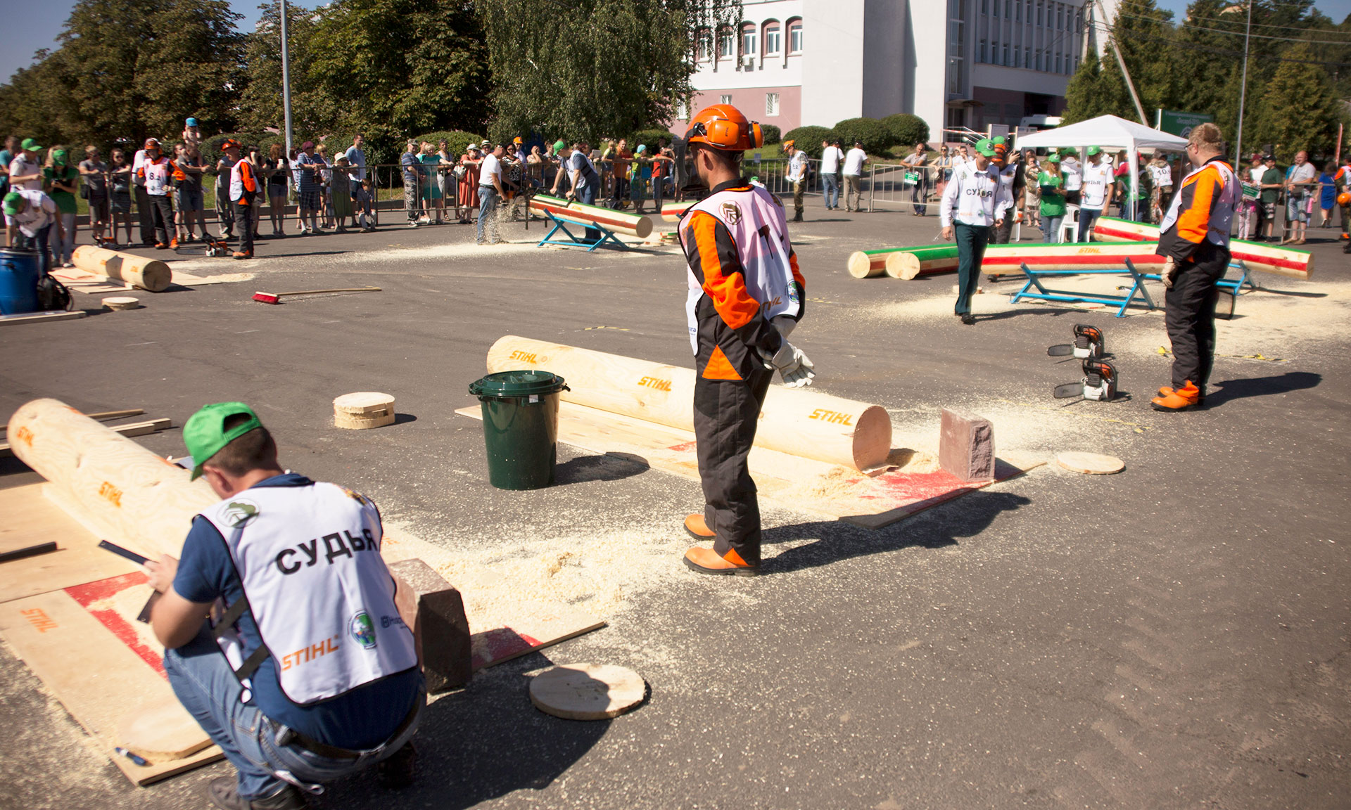 После инструктажа по технике безопасности лесорубы приступили к состязаниям, состоявшим из пяти упражнений. Сначала участникам предстояло на скорость заменить цепь на пиле. На втором этапе лесорубам необходимо было отпилить диски от наклонных брёвен комбинированным резом. Следующим испытанием стала точная раскряжевка бревен. При его выполнении было необходимо точно, быстро и аккуратно отрезать диск заданной толщины от бревна, не повредив при этом настил. Самым сложным и опасным был этап «Валка дерева», который проходил на противоположном берегу за понтонным мостом. Участники должны были спилить установленные стволы таким образом, чтобы они упали в заданном направлении. В заключительном и самом зрелищном упражнении соревнующиеся обрезали сучья на специально подготовленных стволах. При этом засчитывалось не только время выполнения задания. За оставленные сучья выше 5 миллиметров и повреждения ствола начислялись штрафные баллы.