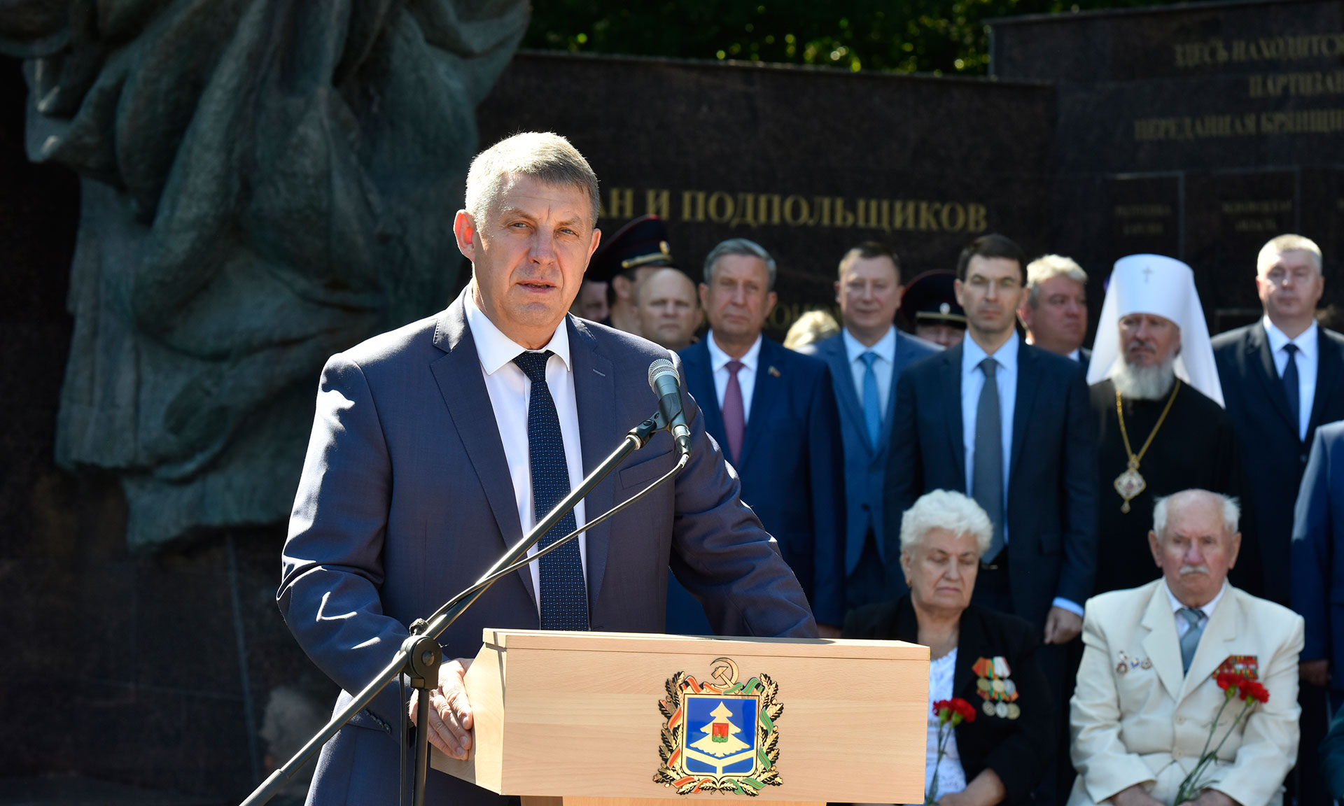По поручению Президента России Владимира Владимировича Путина приветствую всех присутствующих на сегодняшней церемонии. И в первую очередь главных ее участников — ребят, которые сегодня дают торжественную клятву на верность Отечеству, юнармейскому братству. Особенно символично, что вы вступаете в ряды Юнармиии в канун празднования 75-й годовщины освобождения Брянщины от немецко-фашистских захватчиков. В период оккупации здесь непрерывно шло народное сопротивление. Почти 200 Героев Советского Союза воспитала Брянская земля. Среди них люди разных званий и поколений. Вечно молодые Павел Зайцев и Даниил Ананченко совершили бессмертный подвиг, закрыв собой амбразуру вражеских дотов и дав возможность однополчанам одолеть врага. В решающий момент боя рядовой Савелий Дринь бросился под вражескую самоходную артиллерийскую установку со связкой противотанковых гранат.