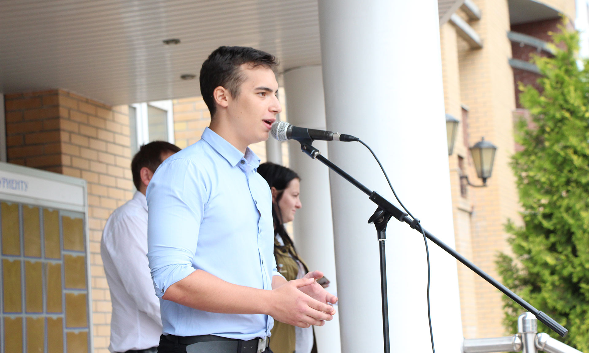 От имени студенчества к участникам акции обратился студент направления подготовки — Государственное и муниципальное управление, член волонтёрского отряда «новое поколение» Виктор Куцин. «Сегодня, вспоминая жертв Беслана и Буденновска, захвата театрального центра на Дубровке и при взрывах жилых домов в Москве, Буйнакске и Волгодонске, станции метро в Санкт — Петербурге и всех террористических актов, а также сотрудников правоохранительных органов, погибших при выполнении служебного долга, мы едины в своем намерении всеми силами противостоять терроризму, как национальному, так и международному, не допустить разрастания этого преступного безумия. В настоящее время во всем мире активизируется антитеррористическое движение, повышается уровень знаний, чтобы решительно противостоять террору всех мастей и не допустить ни второго Беслана, ни второго 11 сентября, ни тех крупных терактов, которые произошли в декабре 2013 года в Волгограде, когда менее чем за сутки прогремели два взрыва на волгоградском железнодорожном вокзале и в городском троллейбусе, унеся жизни 34 человек. Мы, представители молодого поколения Брянщины, будем всеми силами просвещать наших сверстников о противостоянии идеологии терроризма и экстримизма».