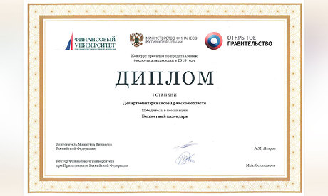 В номинации «Бюджетный календарь» за создание эффективного инструмента, направленного на обеспечение контроля сроков выполнения основных этапов бюджетного цикла, диплом первой степени получил Департамент финансов Брянской области, который ежегодно является участником данного конкурса.