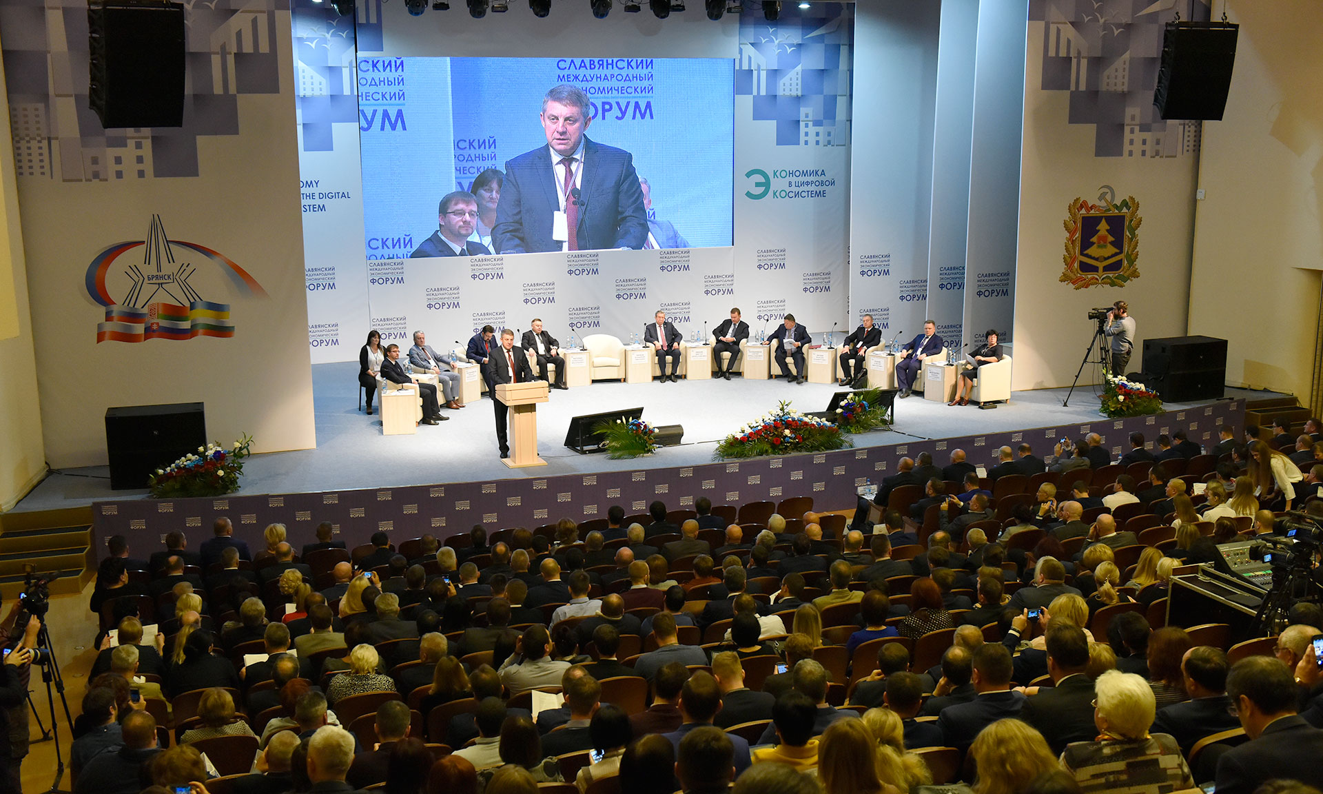 — Я искренне рад приветствовать на гостеприимной Брянской земле, как постоянных участников форума, так и тех, кто впервые приехал в Брянск! Сегодня в этом зале присутствуют наши друзья и партнеры из Белоруссии, представители субъектов Российской Федерации, парламентарии, представители бизнеса, видные общественные деятели.