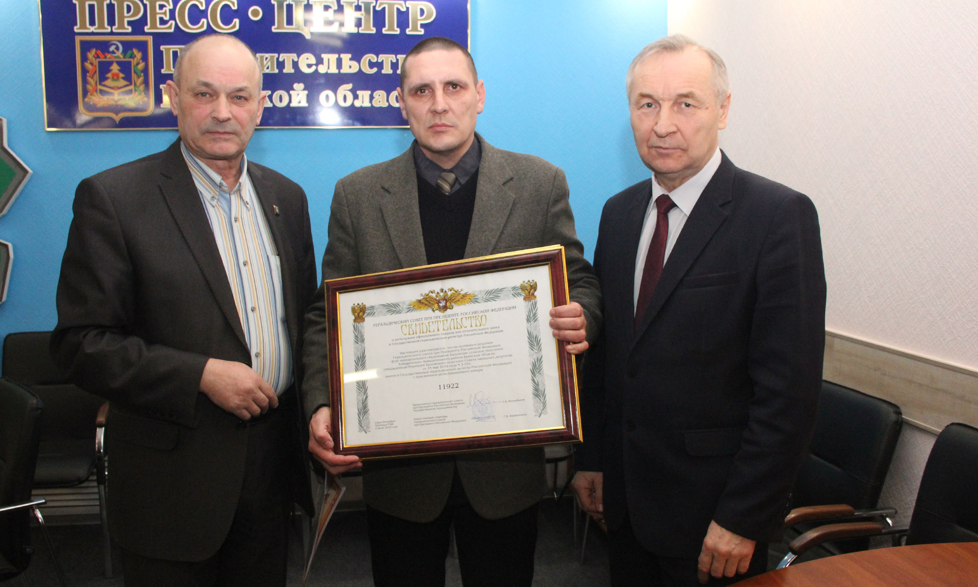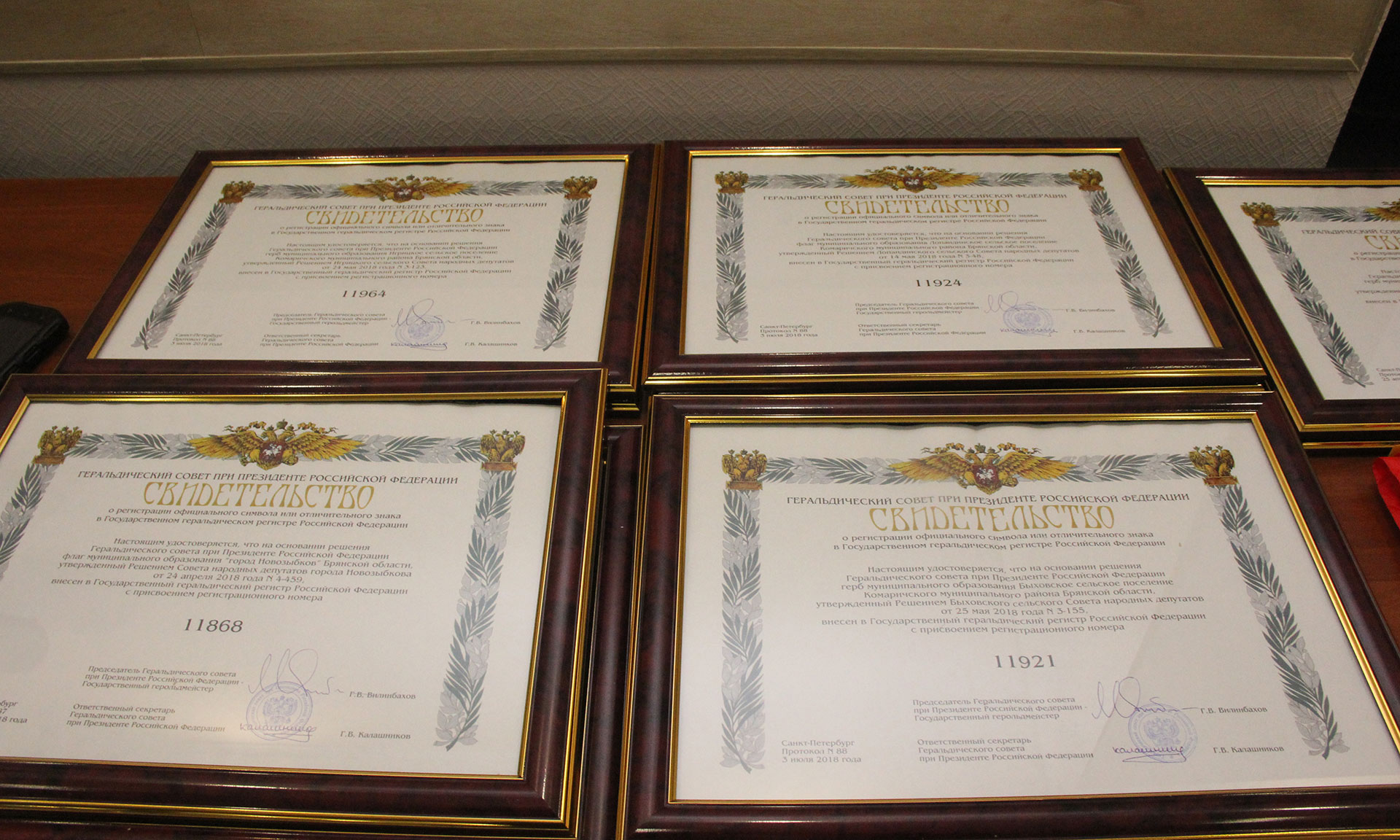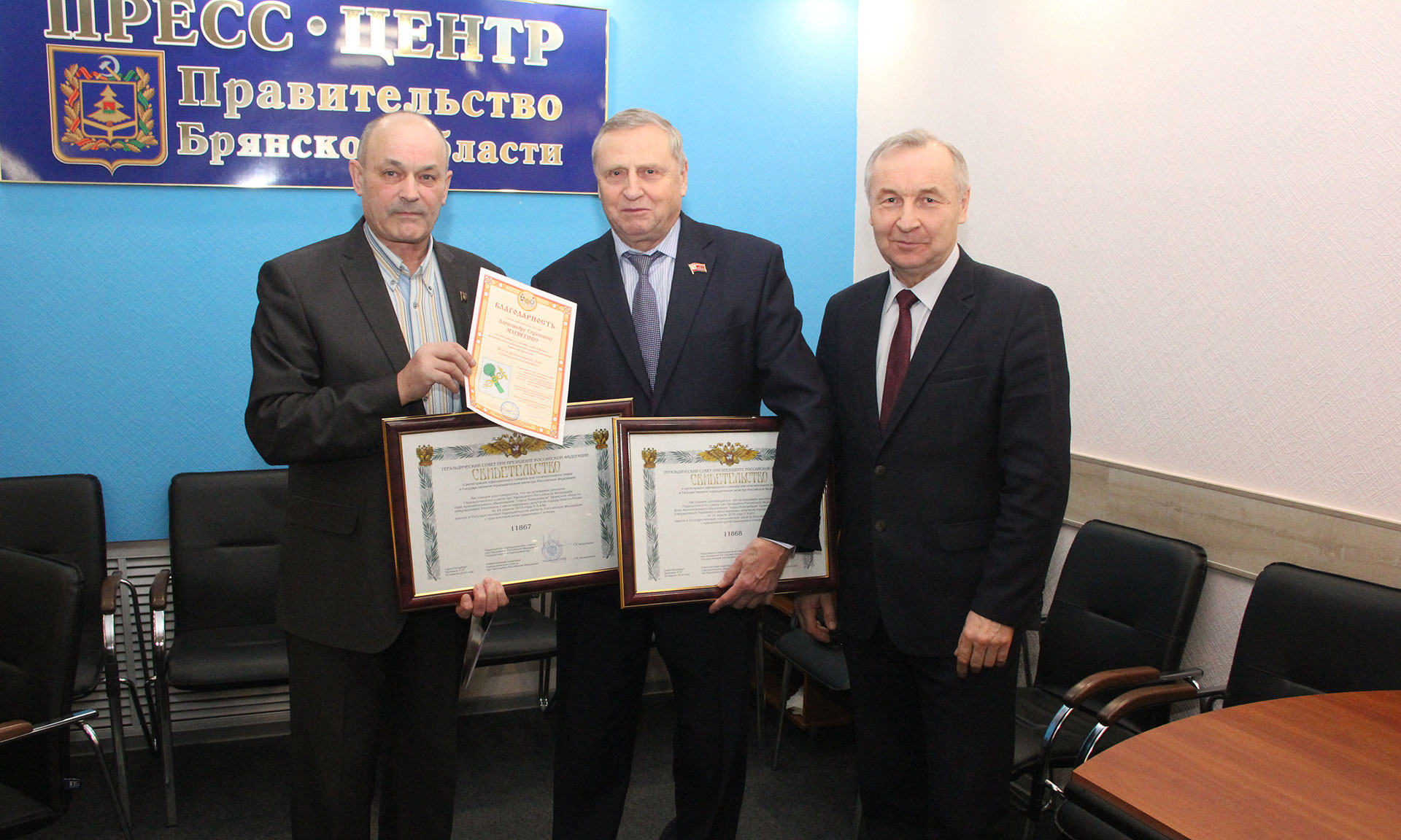 В подтверждение активизации работы муниципальных образований на заседании геральдического совета были вручены свидетельства о регистрации герба и флага в Государственном геральдическом регистре Российской Федерации: городскому округу Новозыбков, Овстугскому сельскому поселению Жуковского района, Игрицкому, Быховскому, Лопандинскому сельским поселениям Комаричского района. Благодарности Союза геральдистов России за содействие в создании герба и флага главам муниципальных образований удостоены: Ольга Кодина, Виктор Пахомов, Александр Рогозин, Александр Матвеенко.