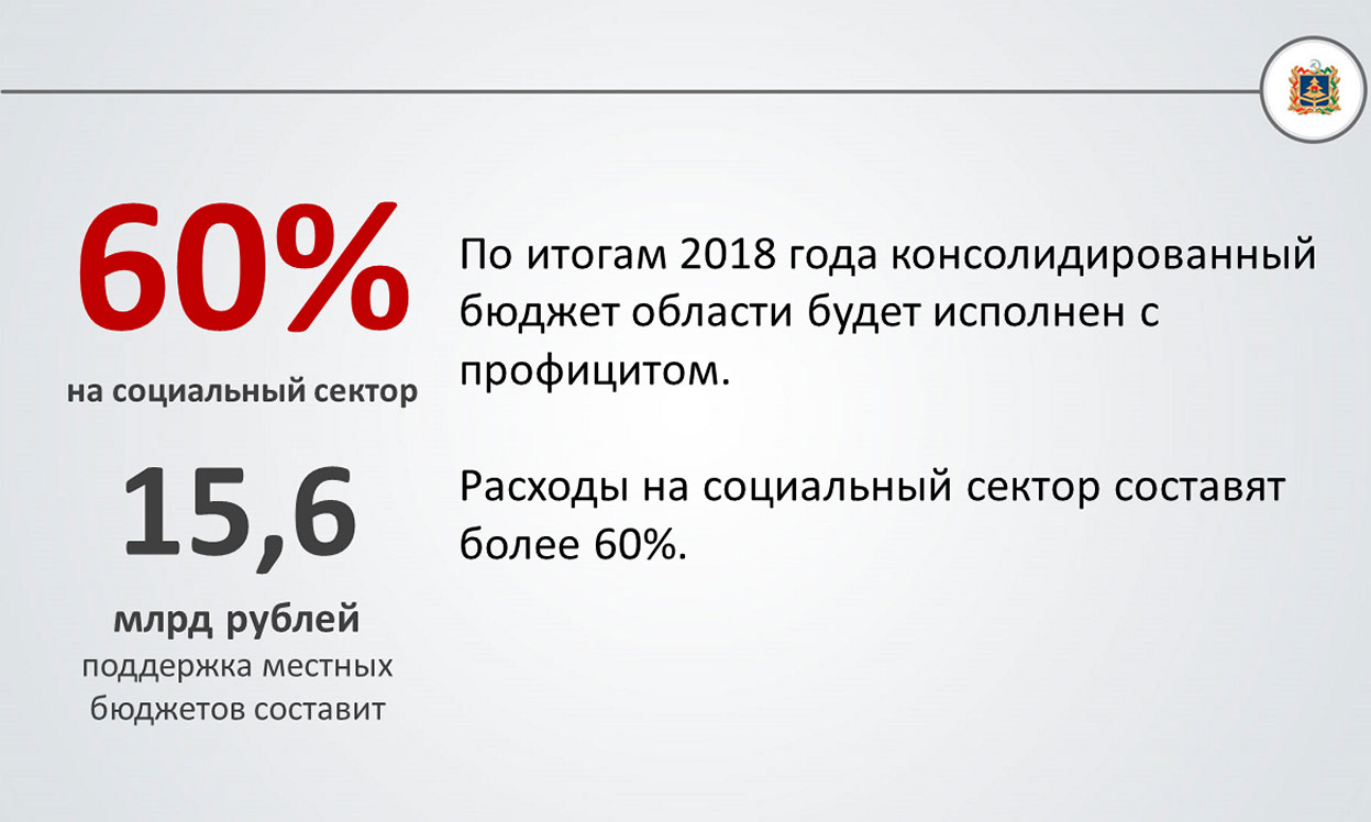 По итогам 2018 года консолидированный бюджет области будет исполнен с профицитом. Расходы на социальный сектор составят более 60%. Будут исполнены все расходные обязательства областного и местных бюджетов: в полном объеме выплачена заработная плата работников бюджетной сферы с учетом досрочной за декабрь текущего года, обеспечено выполнение целевых показателей по оплате труда в рамках реализации майских указов Президента России, проиндексированы социальные выплаты гражданам на уровень инфляции.