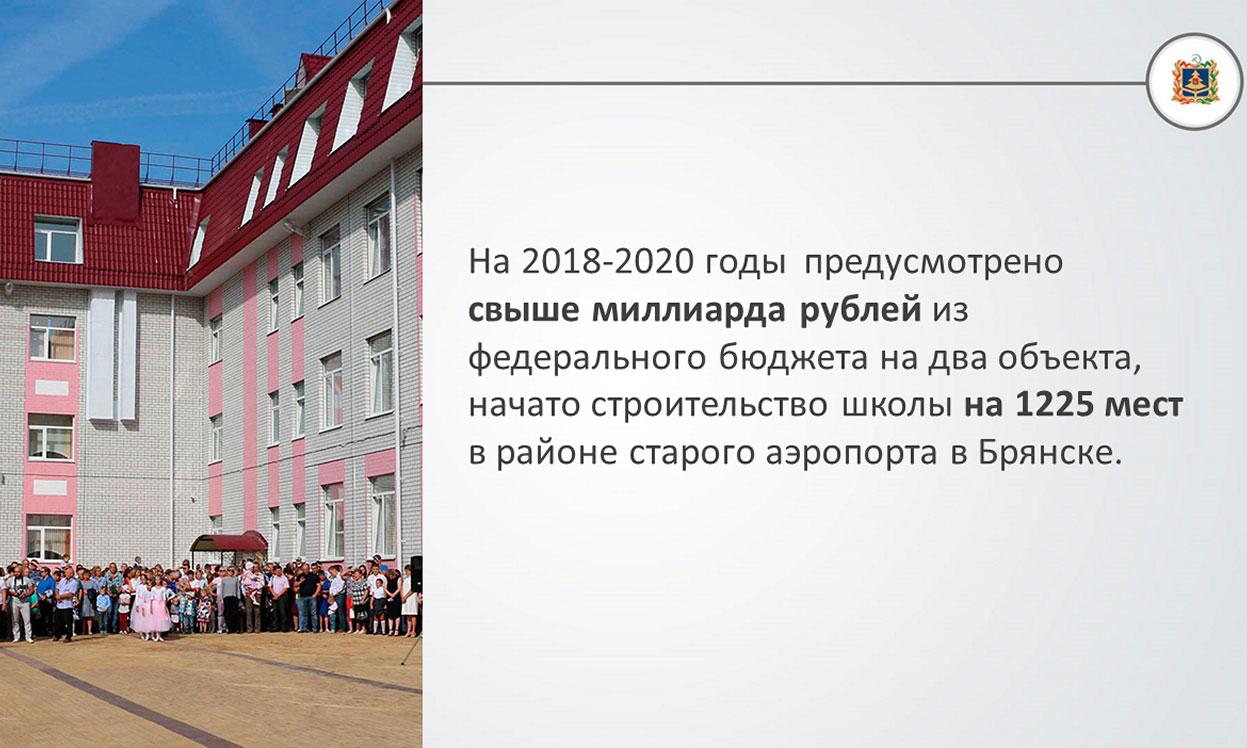 — Мы направляем колоссальные силы и средства на отрасль образования. Наша работа отмечена федеральным центром, соответственно, и наши проекты по созданию новых мест в общеобразовательных организациях Брянской области получили поддержку. На 2018–2020 годы предусмотрено свыше миллиарда рублей из федерального бюджета на два объекта, начато строительство школы на 1225 мест в районе старого аэропорта в Брянске.
