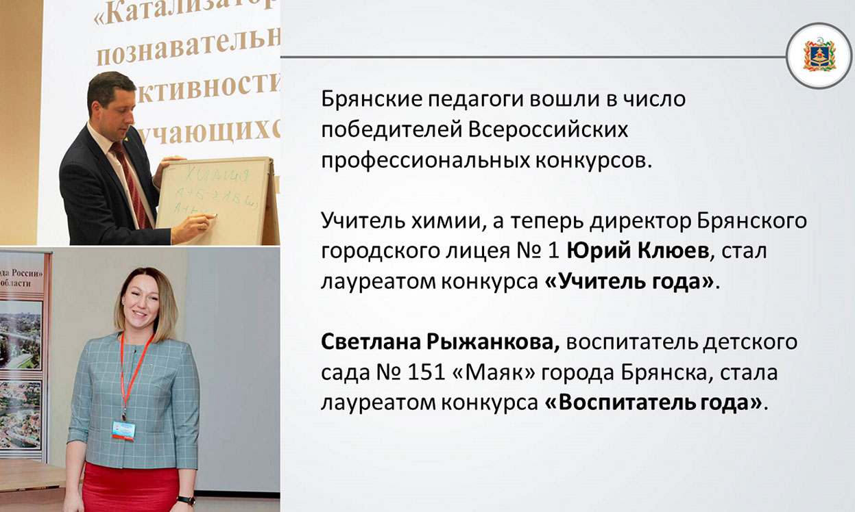 Впервые после долгого затишья наши педагоги вошли в число победителей Всероссийских профессиональных конкурсов. Это учитель химии, а теперь уже директор Брянского городского лицея № 1 Юрий Клюев, ставший лауреатом конкурса «Учитель года», и Светлана Рыжанкова, воспитатель детского сада № 151 «Маяк» города Брянска, победитель регионального этапа конкурса «Воспитатель года».