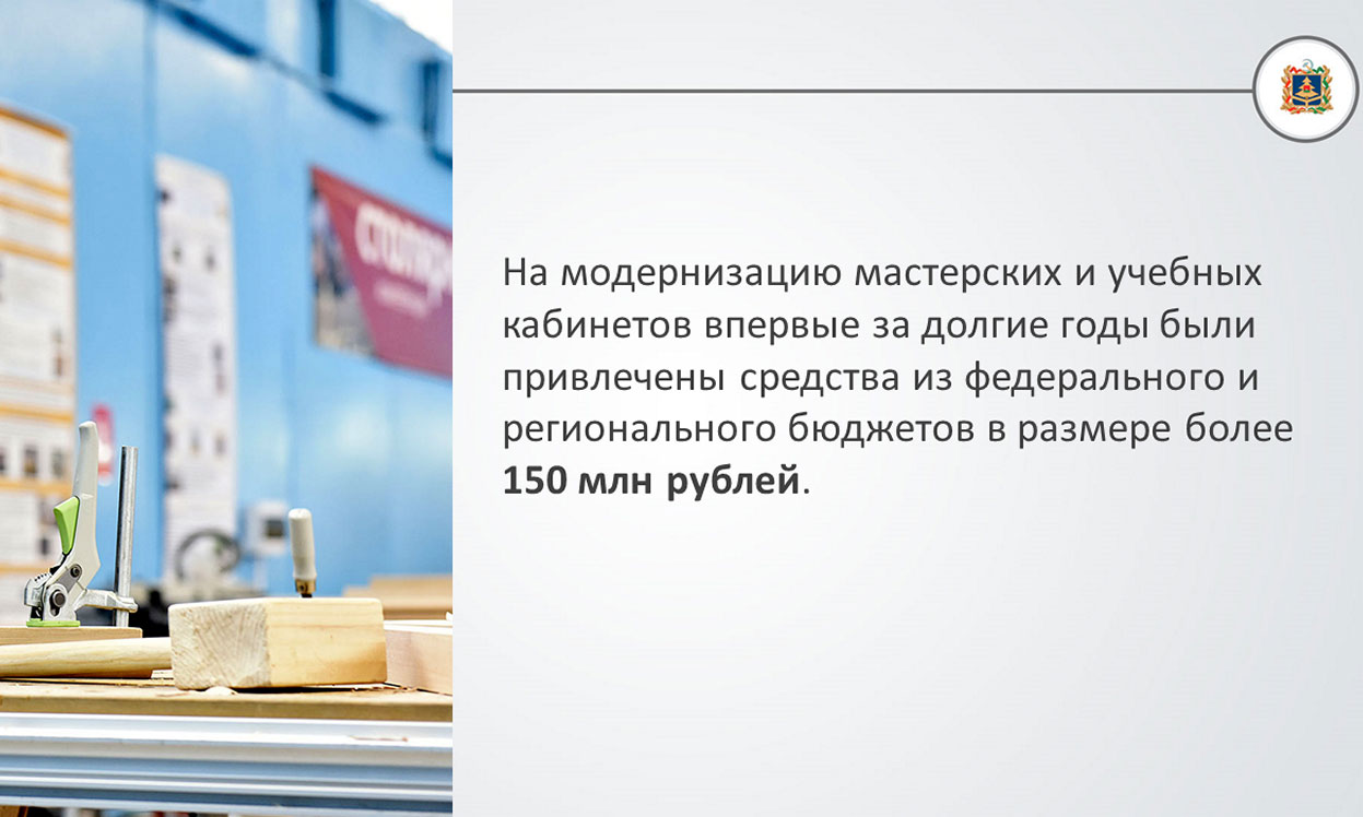 — Для того чтобы таких детей у нас было как можно больше, для их мотивации мы увеличили в два раза размер именных стипендий Брянской областной Думы и Правительства Брянской области лучшим студентам, одаренным детям и молодежи. Про брянские центры технического творчества уже знает вся страна, и очень хотелось бы, что наш детский технопарк «Кванториум», который начнет свою работу в 2019 году, тоже стал настоящей лабораторией талантов. Так же, как стали для учащихся колледжей и техникумов мастерские и учебные кабинеты, на модернизацию которых впервые за долгие годы были привлечены средства из федерального и регионального бюджетов в размере более 150 млн рублей, — сказал Губернатор.