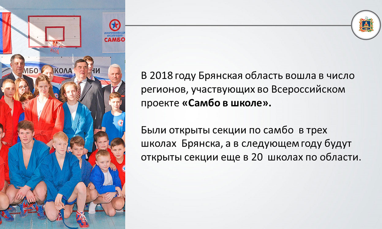 В 2018 году Брянская область вошла в число регионов, участвующих во Всероссийском проекте «Самбо в школе». Были открыты секции по самбо в трех школах Брянска, а в следующем году секции откроются еще в 20 школах по области.