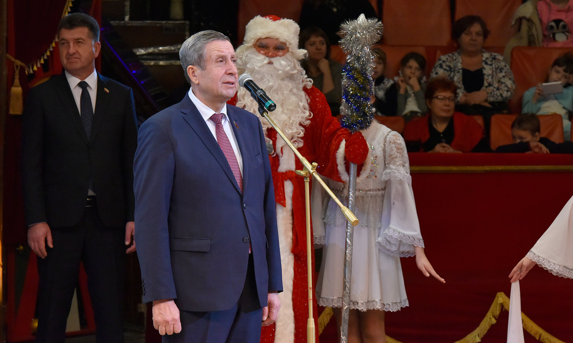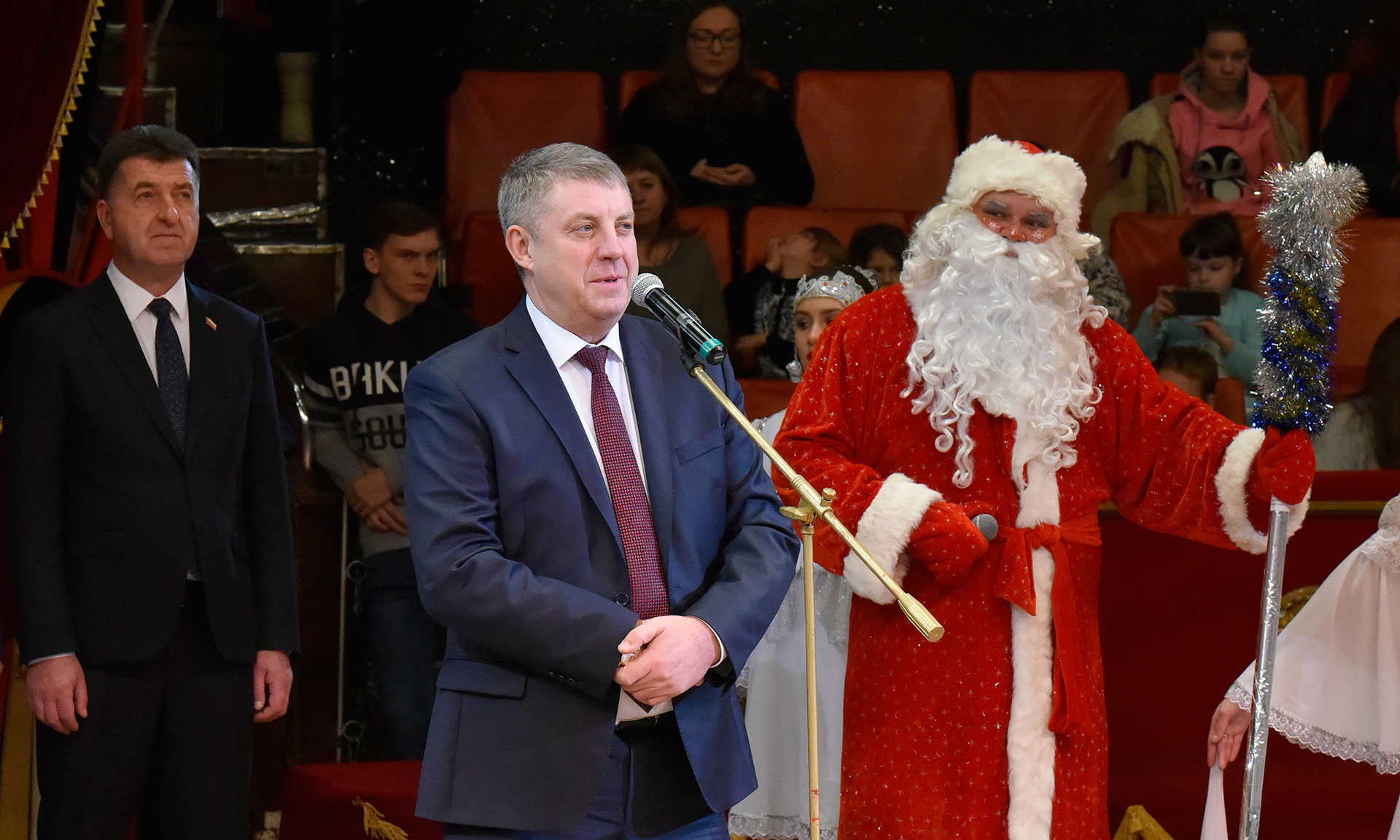 — В Брянской области уже стало хорошей доброй традицией собираться здесь, в государственном цирке, в канун новогодних праздников на новогоднюю елку. Я хочу с радостью констатировать, что сегодня вот эта наша прекрасная арена, цирк, собрал почти 2 тысячи детей из различных уголков нашей родной Брянщины.