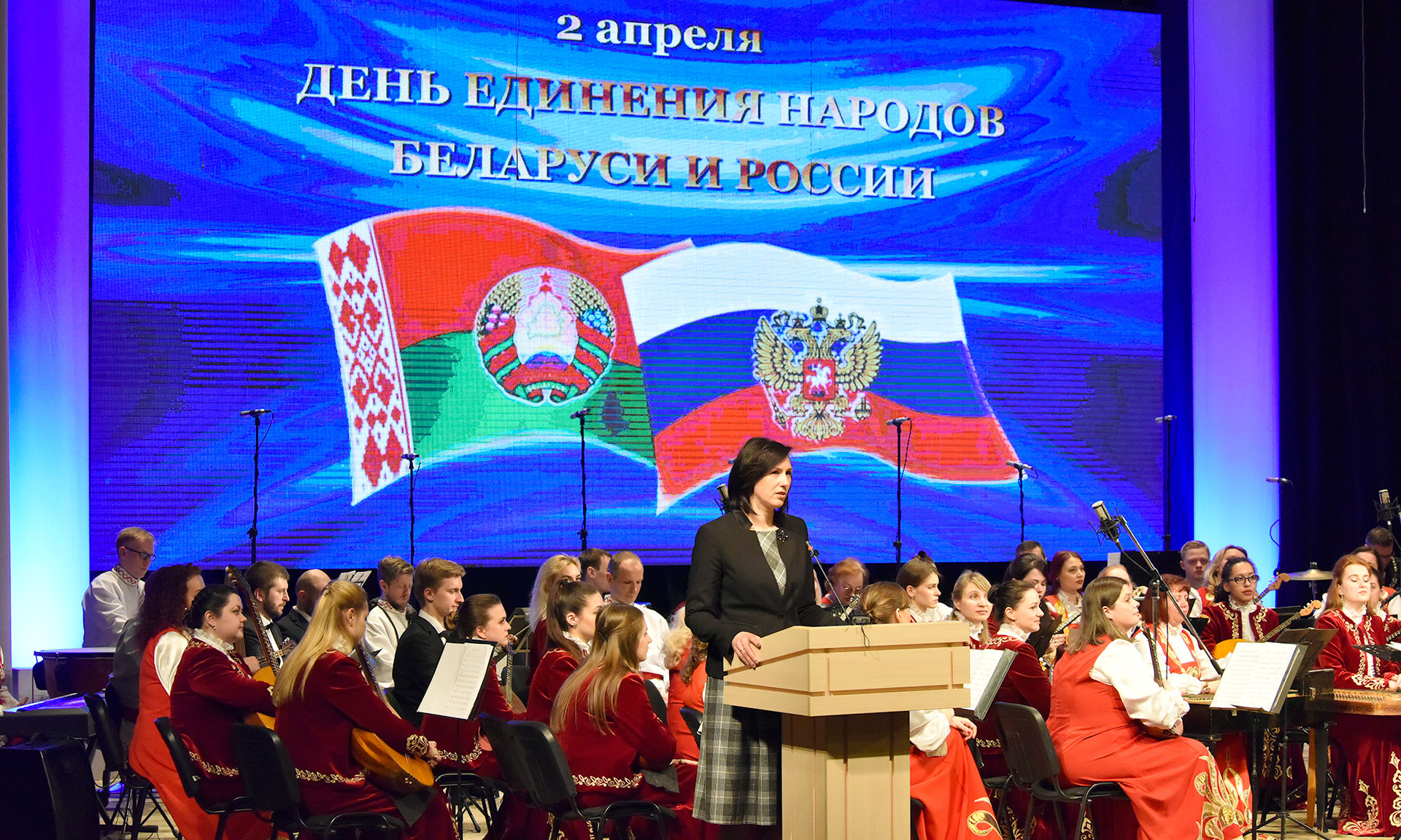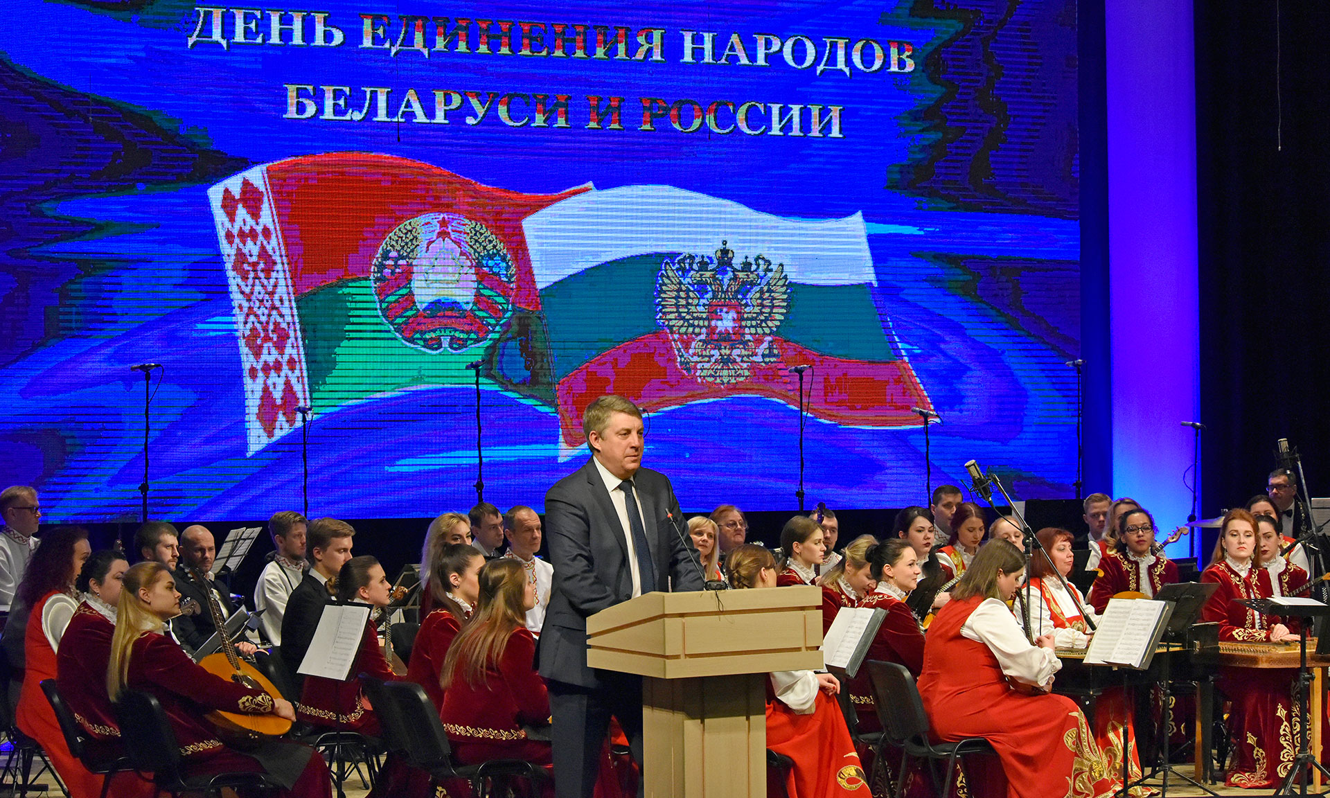 — День единения — это, наверное, не только знаменательная дата для наших народов, но и подтверждение нашей духовной и культурной общности. Сегодня на сцене представлен белорусско-российский оркестр народных инструментов. Благодаря приглашению российской стороны, мы участвуем в этом проекте. Мы прибыли в Брянск вчера, состоялись всего две репетиции, но мы уверены, что сегодня получим качественный продукт, потому что мы настолько близки и понятны друг другу, что всего лишь две репетиции позволили создать шедевр на этой сцене.