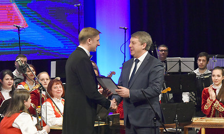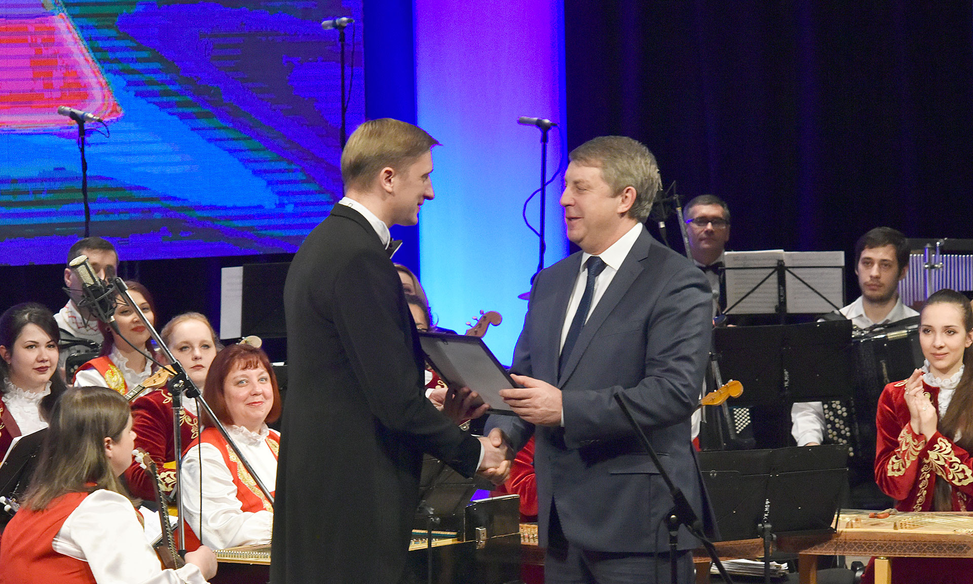 Губернатор Брянской области Александр Богомаз вручил Благодарственное письмо за большую работу по развитию международных культурных связей, патриотическое воспитание молодежи, активную концертную деятельность Заслуженному коллективу Республики Беларусь, оркестру народных инструментов имени Народного артиста Беларуси Леонида Иванова Могилевской областной филармонии (главный дирижер и художественный руководитель — Денис Черта).