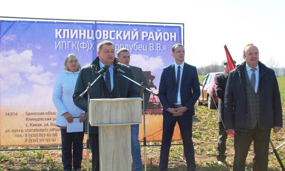 5 апреля в Клинцовском районе на базе ИП Глава К(Ф)Х «Стародубец В.В." состоялся семинар-совещание, посвящённый весенне-полевым работам. В работе семинара приняли участие вице-губернатор Брянской области Александр Резунов, руководитель областного департамента сельского хозяйства Борис Грибанов, проректор Брянского государственного аграрного университета Владимир Ториков, главы администраций муниципальных образований, начальники районных управлений сельского хозяйства, руководители федеральных служб и руководители сельхозпредприятий области.