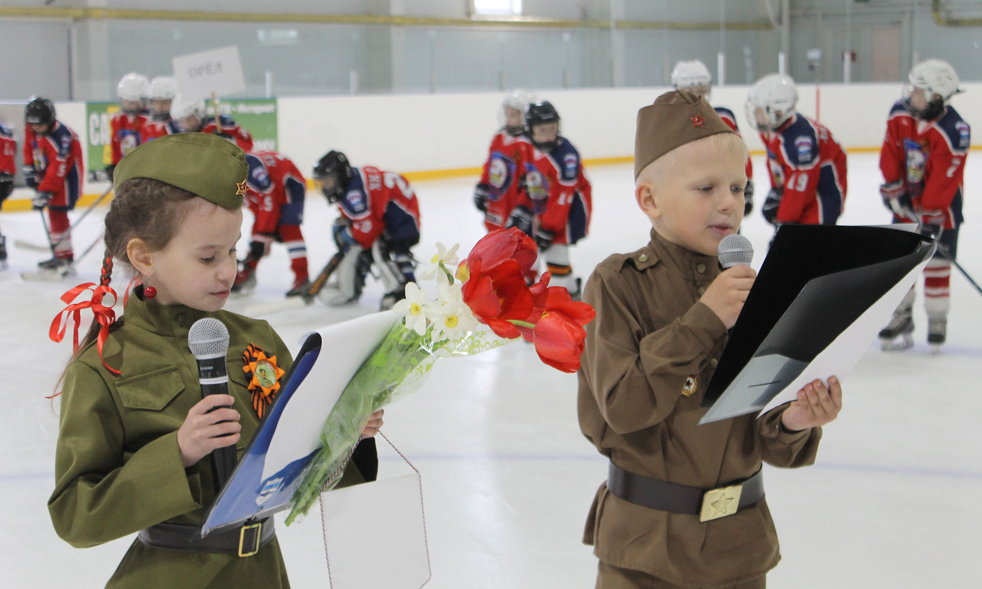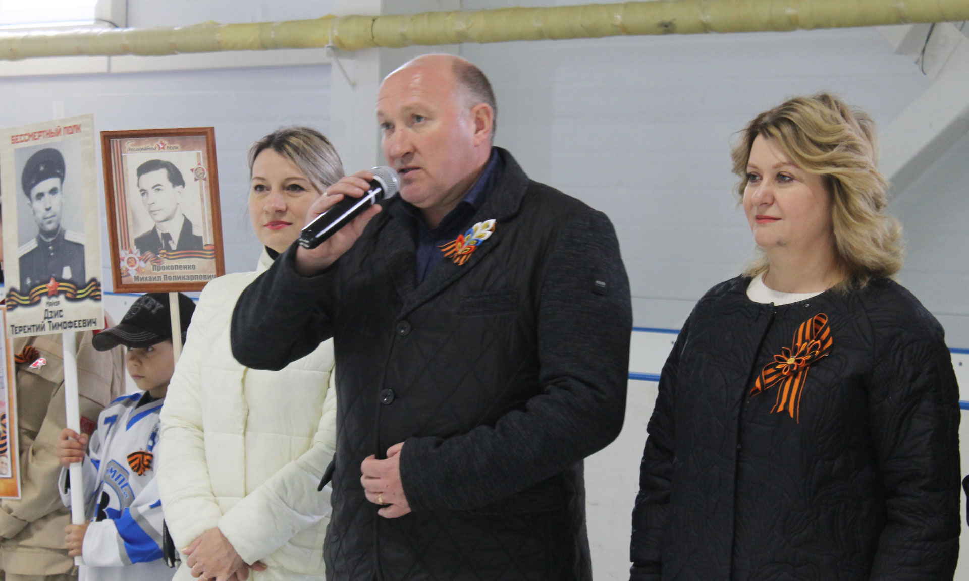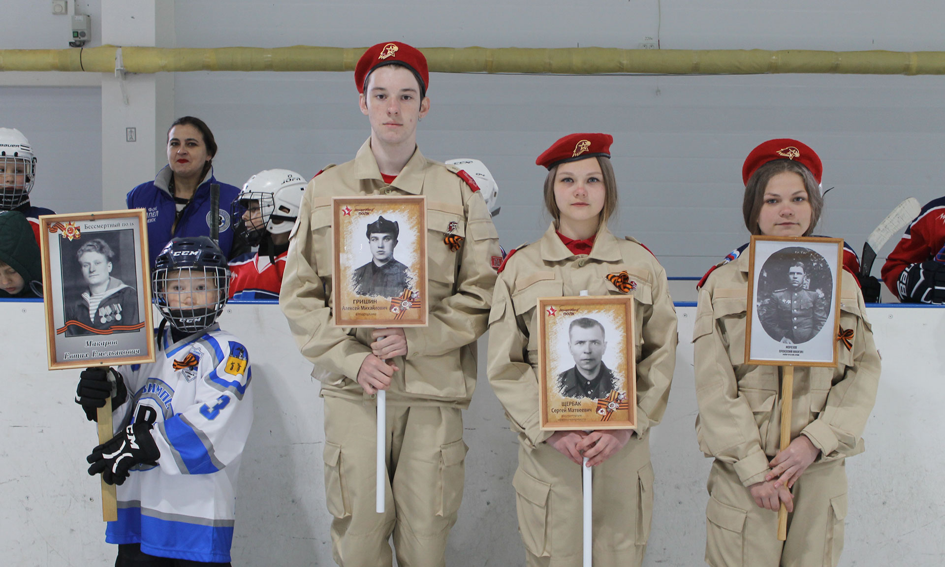 Особую атмосферу и торжественность мероприятию придало появление участников акции «Бессмертный полк» — воспитанников хоккейной секции «Вымпела» и трубчевских юнармейцев — с портретами своих героических предков — участников и ветеранов Великой Отечественной войны.