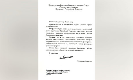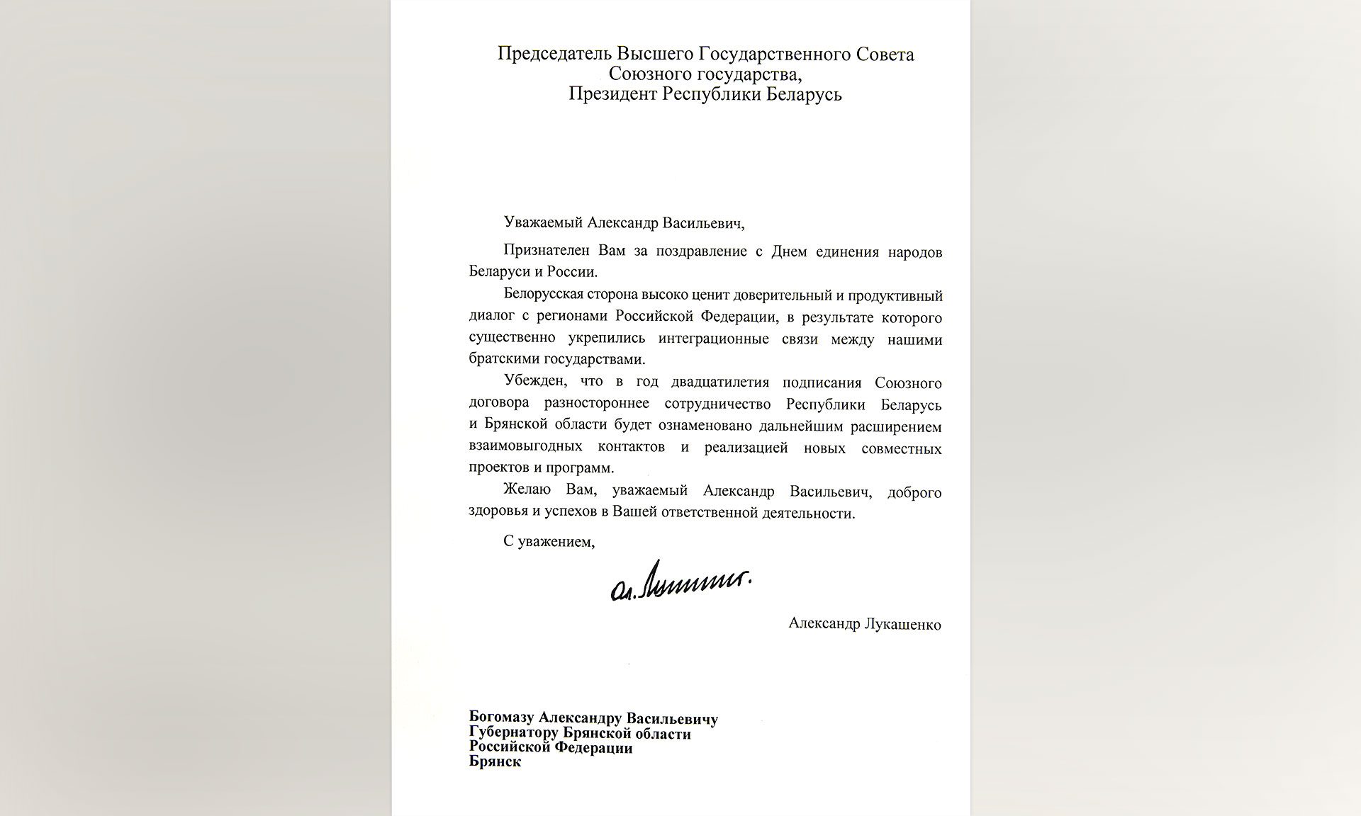 Председатель Высшего Государственного Совета Союзного государства, Президент Республики Беларусь Александр Лукашенко прислал письмо со словами благодарности на имя Губернатора Брянской области Александра Богомаза. Он, в частности, отметил: