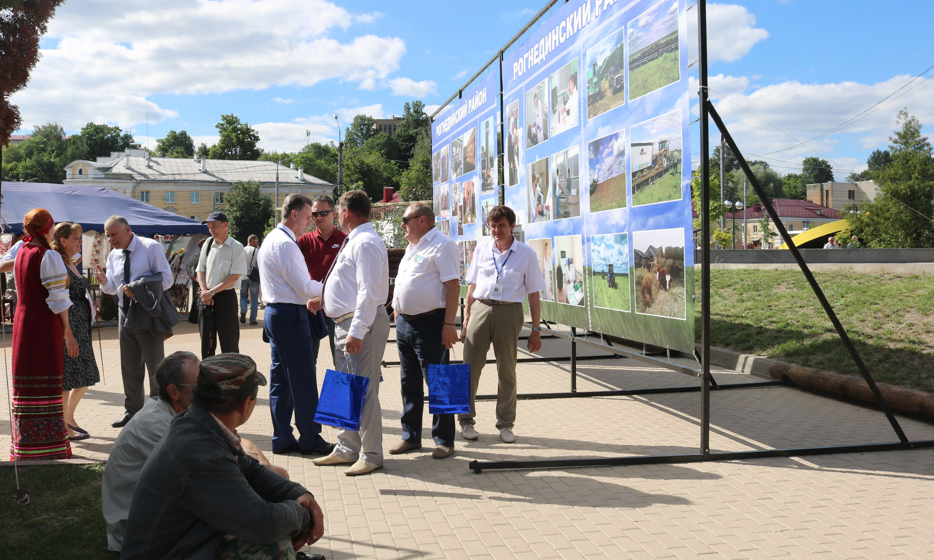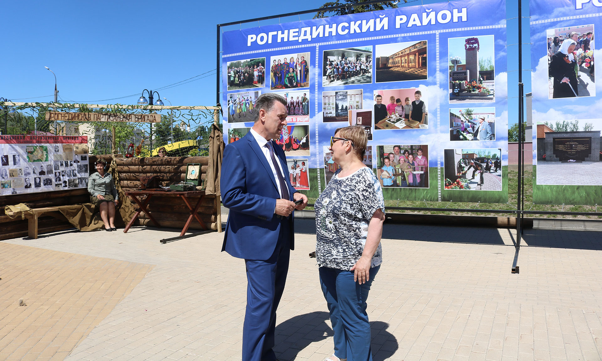Почетные гости с интересом рассматривали представленную на выставке продукцию сельскохозяйственного и промышленного производства, заинтересовались старинной технологией производства льна, попробовали сыр производства КФХ, любовались поделками народных рогнединских умельцев, детским творчеством, литературной выставкой и экспозицией Тюнинской школы им. Н. И. Рыленкова, немало времени провели на стоянке партизанской бригады.