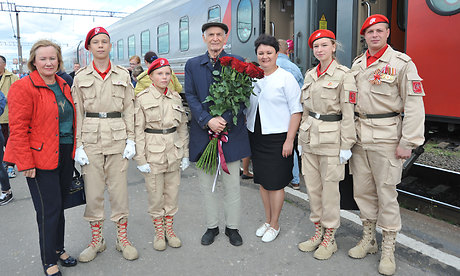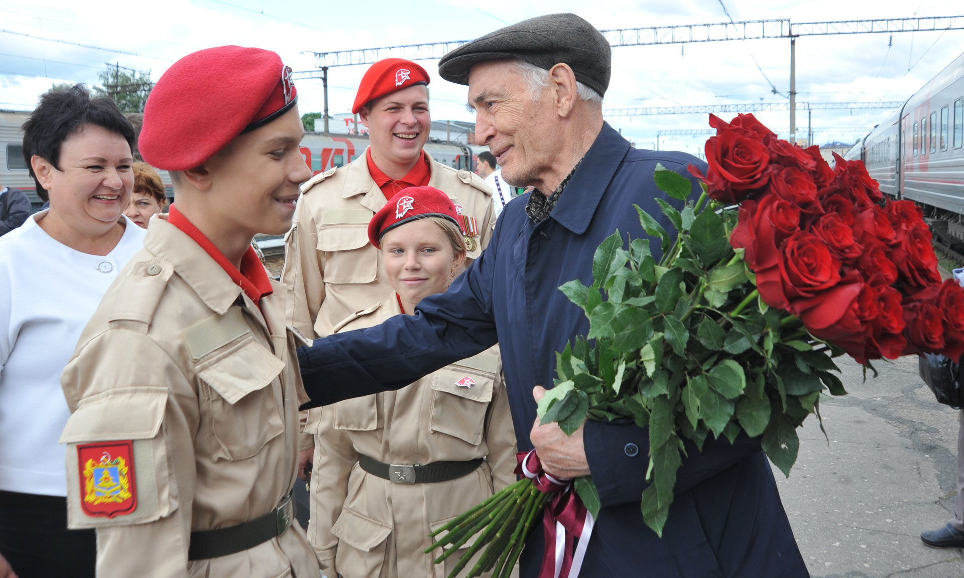 Василия Семеновича Ланового на железнодорожном вокзале встретили директор департамента культуры Брянской области Елена Кривцова и брянские юнармейцы. Почетному гостю вручили букет цветов.