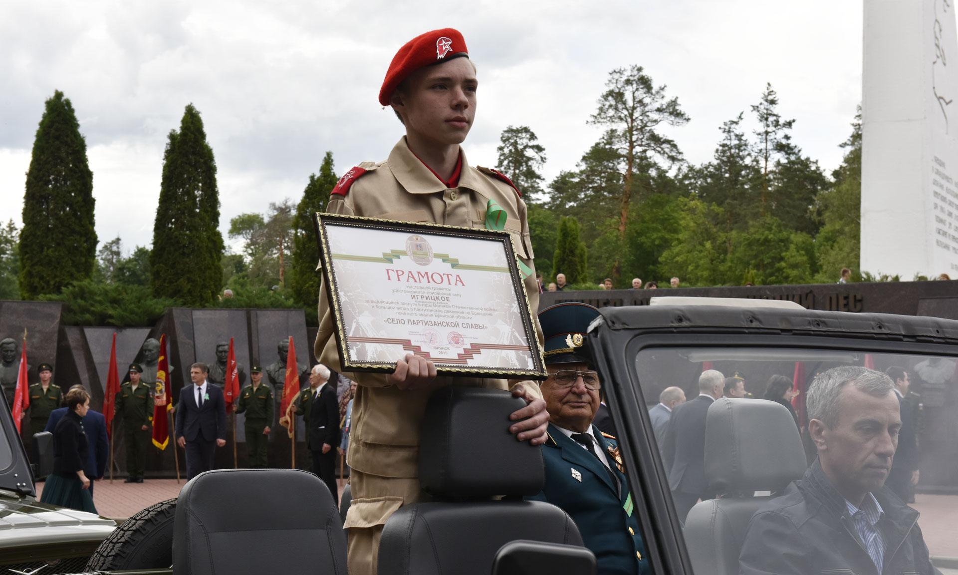 Прямо с Партизанской Поляны грамоты доставлены в населенные пункты, которым присвоены почетные звания. Почетное право доставить получили ветераны Великой Отечественной войны и юнармейцы.