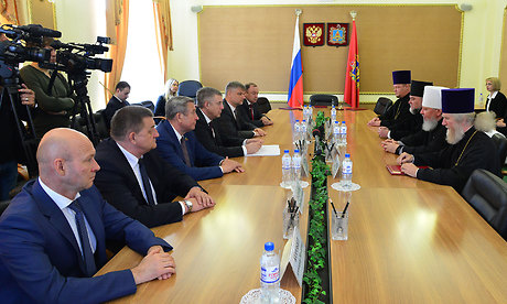 Губернатор Александр Богомаз начал встречу с приветственных слов в адрес Брянской Митрополии. Глава региона особо отметил роль духовенства в вопросах патриотического воспитания, развития духовно-нравственных чувств, в работе по восстановлению и строительству святынь на территории области.