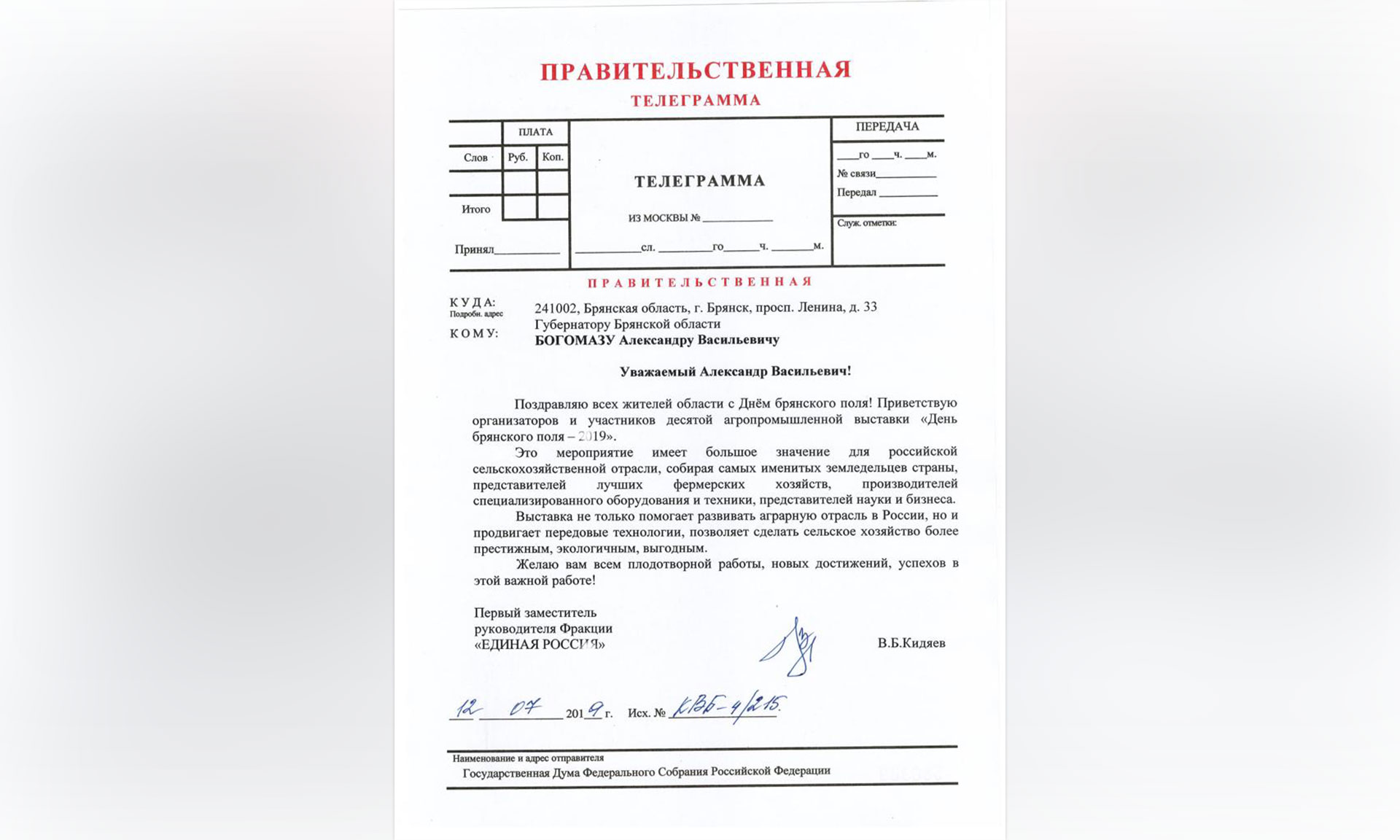 В адрес Губернатора Брянской области Александра Богомаза поступила телеграмма за подписью Президента Общероссийского Конгресса муниципальных образований, первого заместителя руководителя фракции «Единая Россия» Государственной Думы ФС РФ Виктора Кидяева. В телеграмме, в частности, говорится: