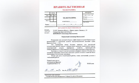 «Уважаемый Александр Васильевич! Поздравляю всех жителей Брянской области с Днем брянского поля! Приветствую организаторов и участников десятой агропромышленной выставки «День брянского поля — 2019».