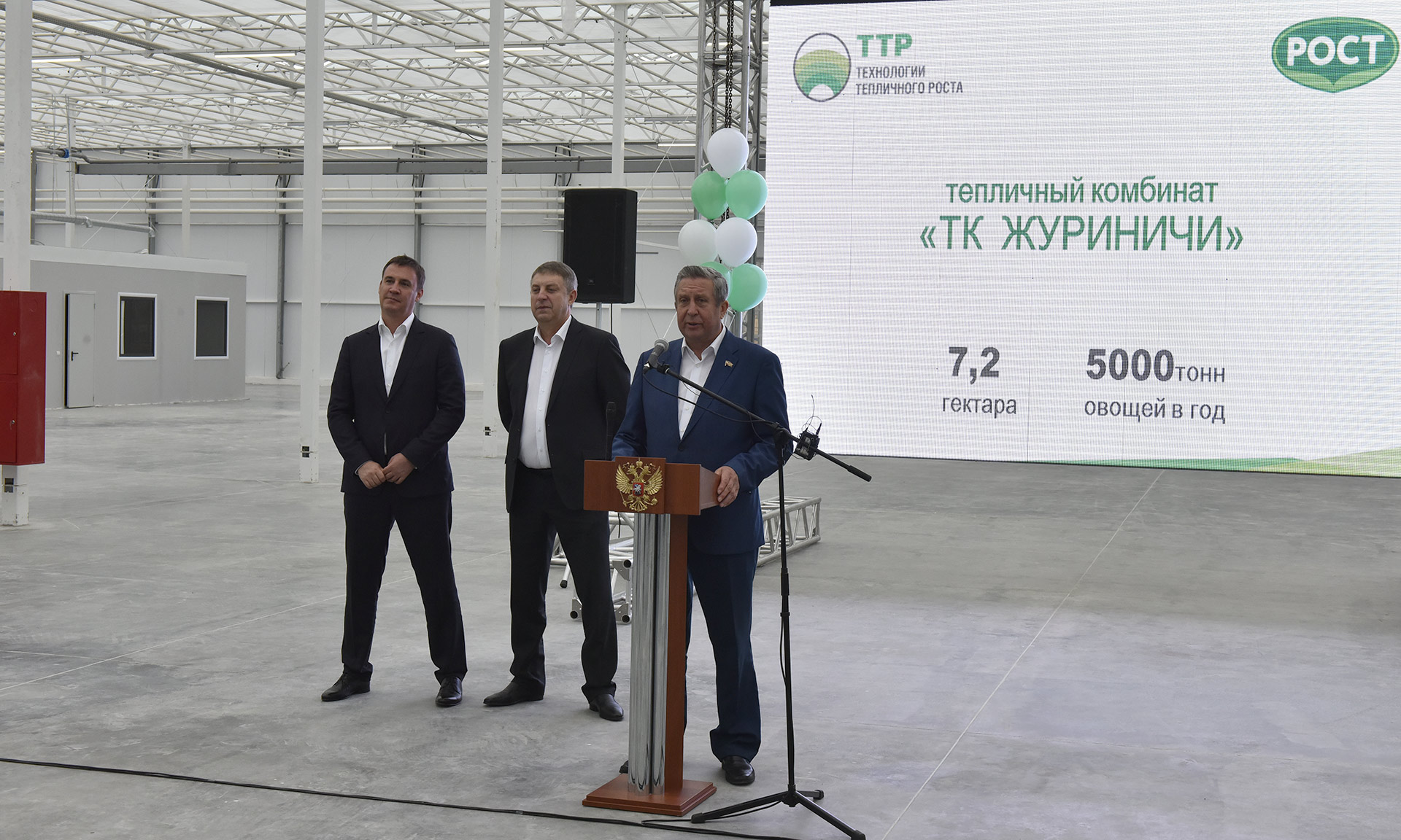 — Мы сегодня имеем честь присутствовать на открытии замечательного тепличного комплекса. Короткое время прошло с того момента, когда Сергей Ильич Рукин принял решение заложить здесь столь масштабное сооружение, и при поддержке Александра Васильевича Богомаза, при поддержке министерства сельского хозяйства ему все это удалось реализовать.
