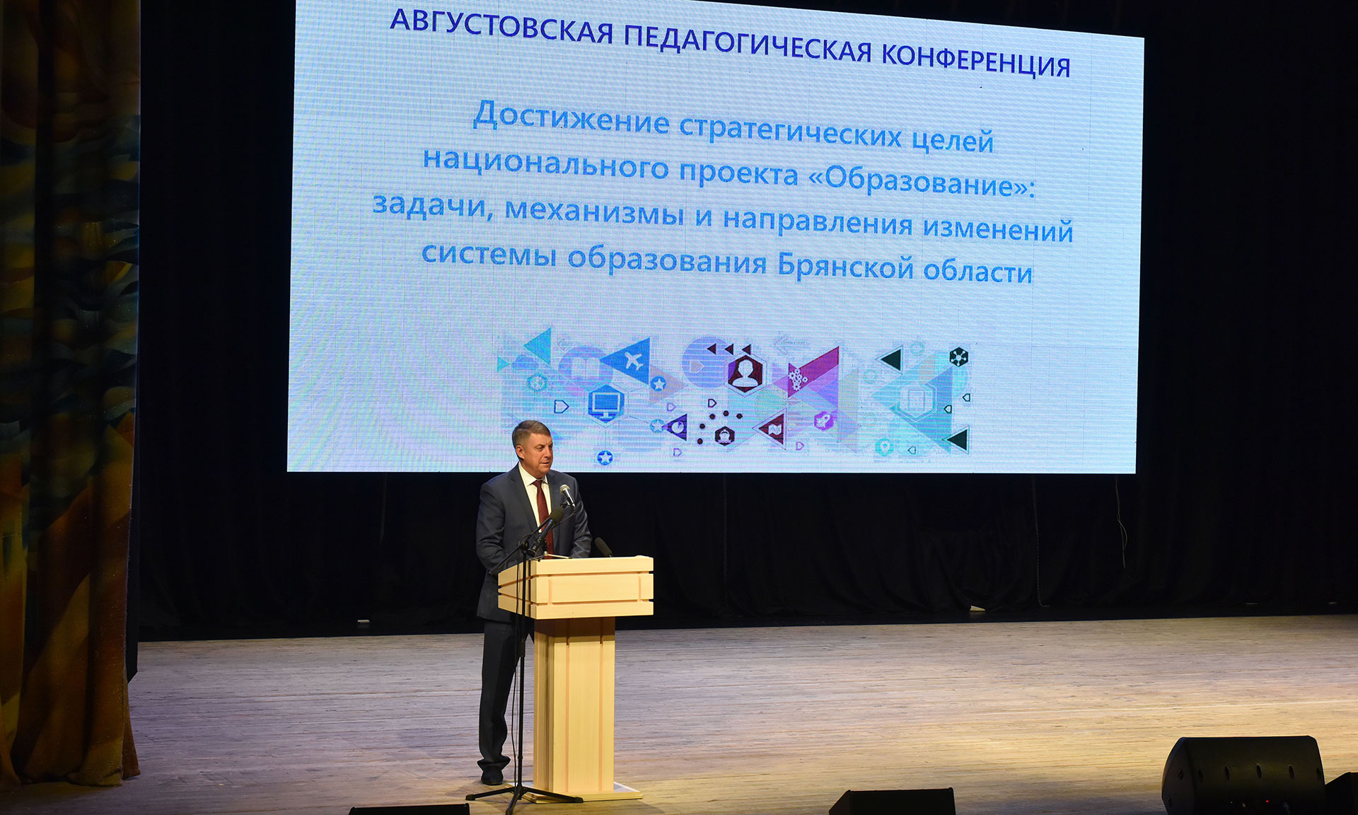 — Такого духа, который присутствует не только здесь в зале, но и во всей системе образования Брянской области, наверное, поискать еще надо! Спасибо вам за это! И, конечно же, от всей души приветствую Вас на августовской педагогической конференции, посвященной как вопросам и целям предстоящего нового учебного года, так и долгосрочным перспективам развития системы образования. Указом Президента Российской Федерации от 2018 года перед системой образования поставлены амбициозные задачи: вхождение в число десяти ведущих стран мира по качеству общего образования. И, кроме всего прочего, очень важная задача — воспитание гармонично развитой и социально ответственной личности на основе духовно-нравственных традиций, ценностей народов Российской Федерации. Эти цели лежат в основе национального проекта «Образование», на реализацию которого в 2019 году из федерального бюджета выделено почти 106 миллиардов рублей. Всего же запланировано более чем 784 миллиарда рублей до 2024 года.