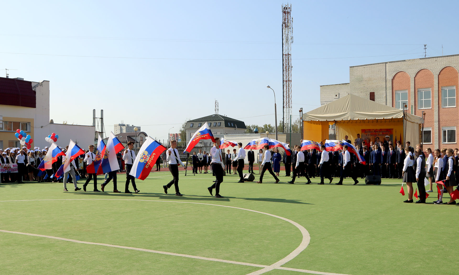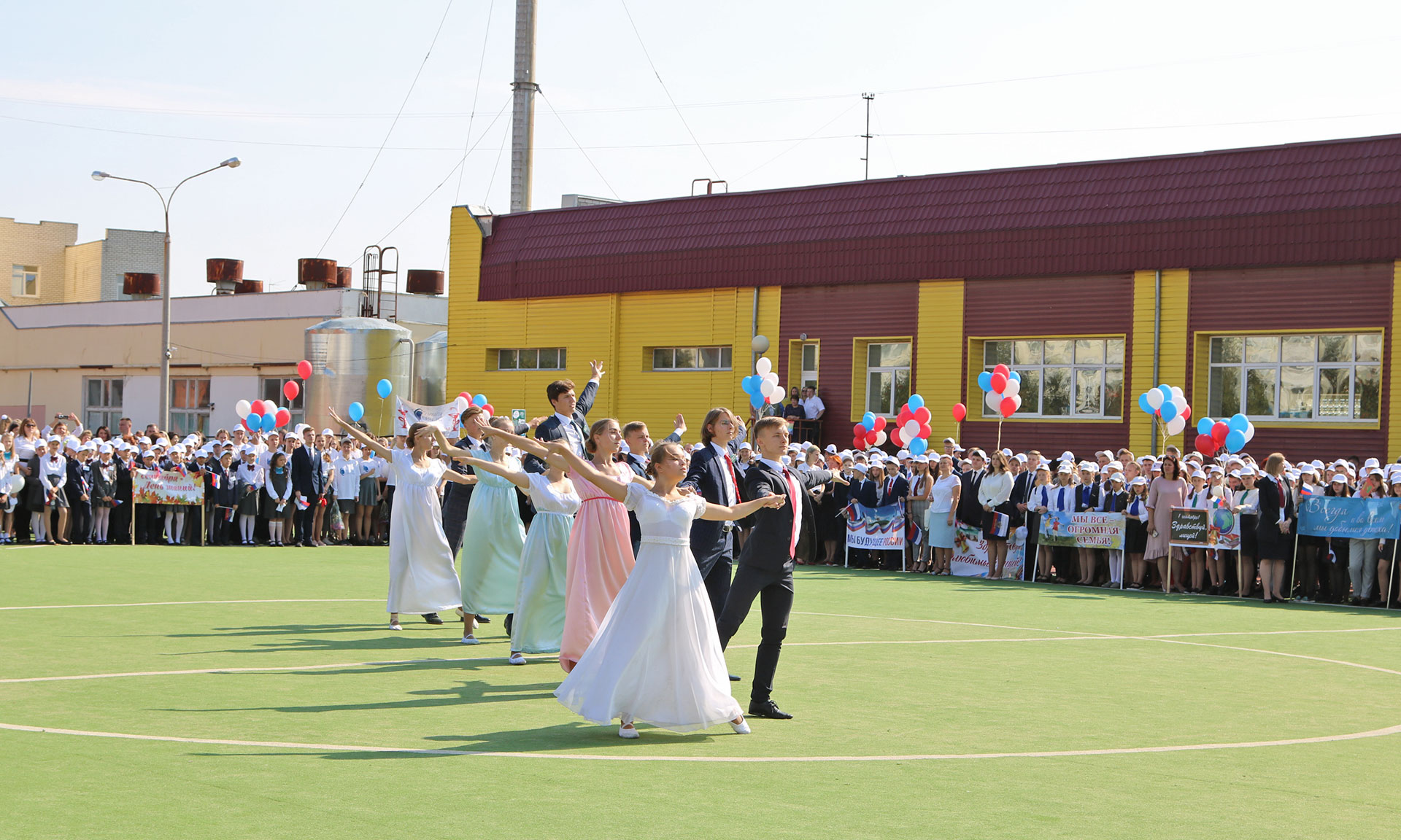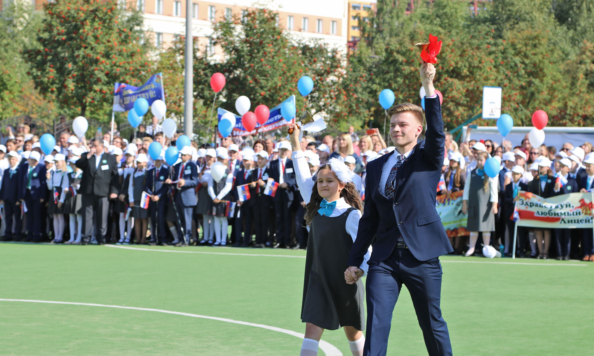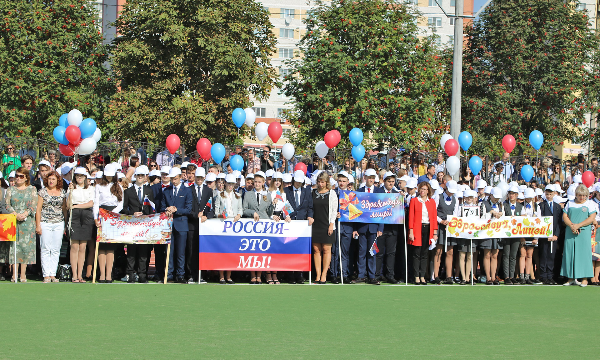 В завершении торжественной линейки лицеисты выпустили в небо сотни шаров цвета Российского флага.