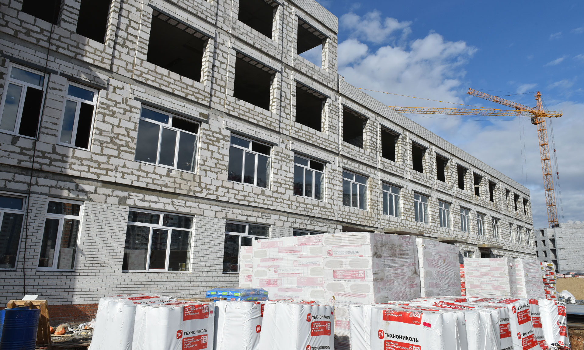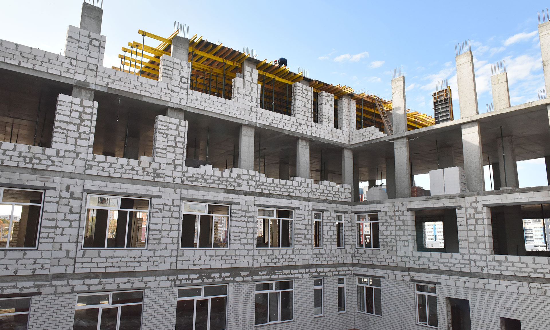 Здание школы — четырехэтажное, в котором разместится несколько функциональных блоков: блок начальных классов, спортблок, общественная зона, пищеблок, административная зона. Срок ввода школы в эксплуатацию — июнь 2020 года. Здесь выполняются работы по возведению монолитного каркаса, электромонтажные и сантехнические, прокладываются сети водо- и теплоснабжения, выполнено устройство чаши бассейна.