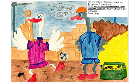 - конкурсная работа «Осторожно, стройка!» Ивана Другова, 9 лет, отделение дополнительного образования «Дом детского творчества имени Героя России О. Визнюка» МБОУ «Лицей № 27 имени Героя Советского Союза И. Е. Кустова», г. Брянск;