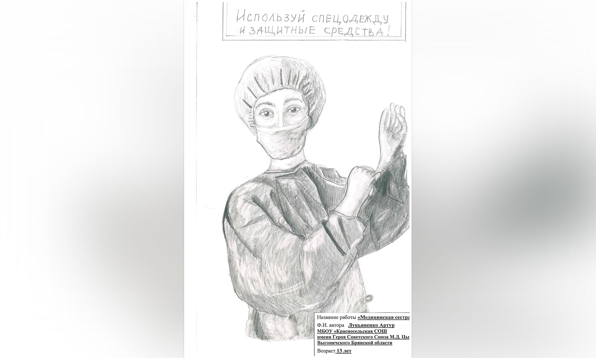 - конкурсная работа «Медицинская сестра» Лукьяненко Артура, 13 лет, МБОУ «Красносельская средняя общеобразовательная школа имени Героя Советского Союза М. Д. Цыкина», с. Красное Выгоничского района Брянской области;