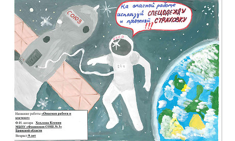 - конкурсная работа «Опасная работа в космосе» Хохловой Ксении, 9 лет, МБОУ «Фокинская средняя общеобразовательная школа № 3», г. Фокино Дятьковского района Брянской области;
