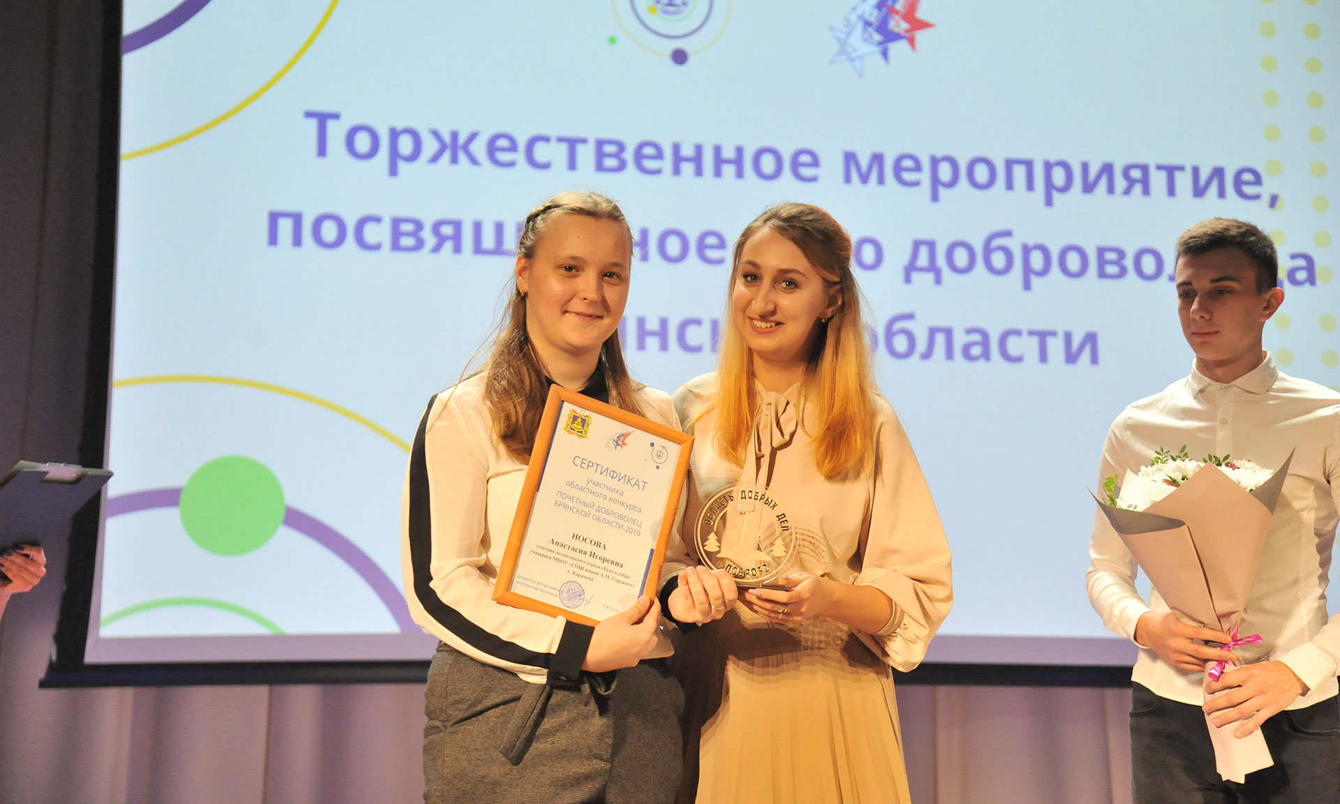 Полуфиналистов и финалиста федерального конкурса «Доброволец России-2019» наградили «Лучший доброволец России-2018 года», руководитель проекта «Здоровое село» и «Добро в село» Антон Коротченко и руководитель центра по развитию добровольческого движения и общественных инициатив Брянской области Юлия Устинова. Полуфиналистами конкурса стали: благотворительный фонд помощи детям с онкогематологическими и иными тяжелыми заболеваниями «Ванечка» (директор Фонда — Ирина Цыганкова), общественная организация «Белые Берега» (председатель — Василий Шаматрин), Ольга Соболева (проект «Ничто не забыто!», номинация «Уверенные в будущем»), Дмитрий Саркулов (проект «Центр содействия полиции», номинация «Смелые сердцем»).