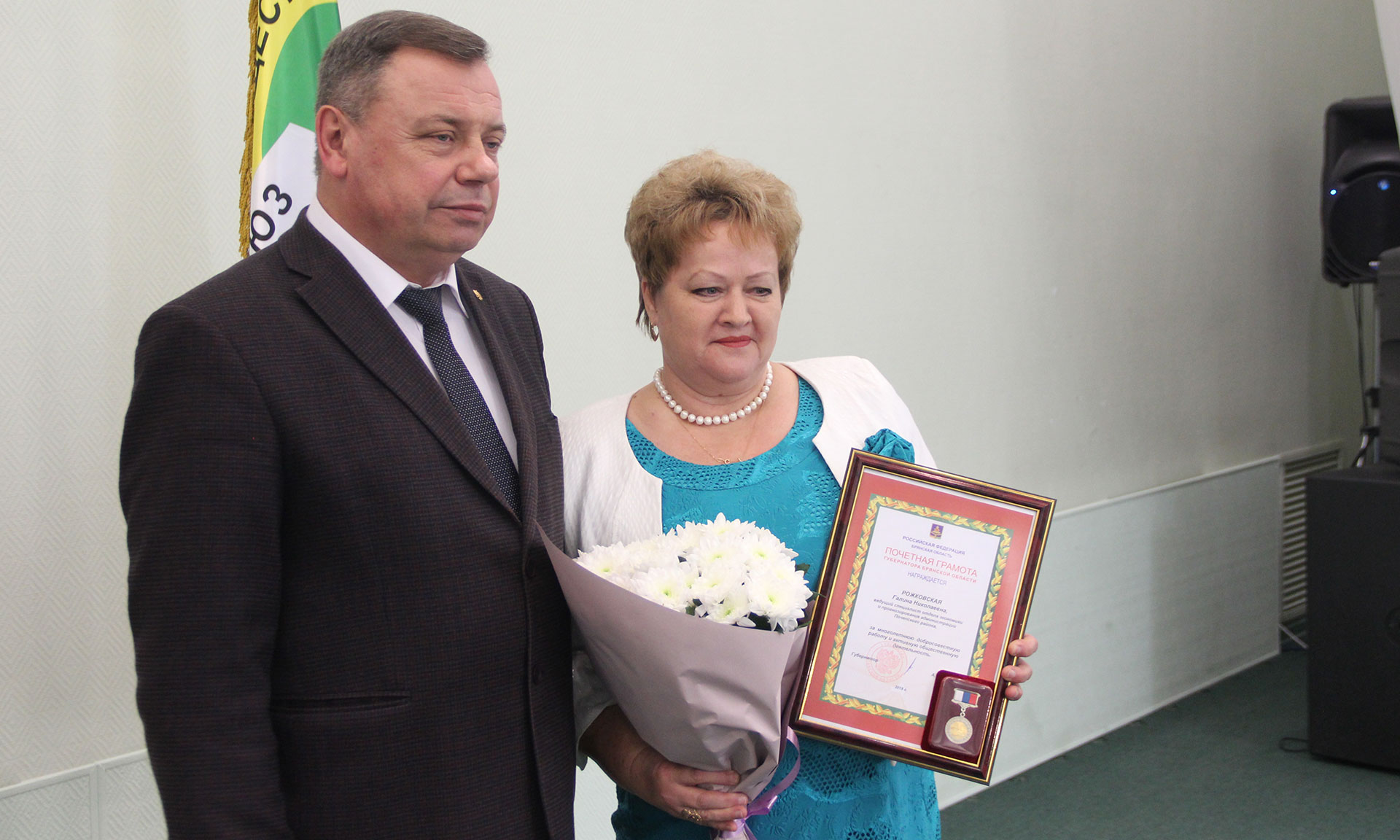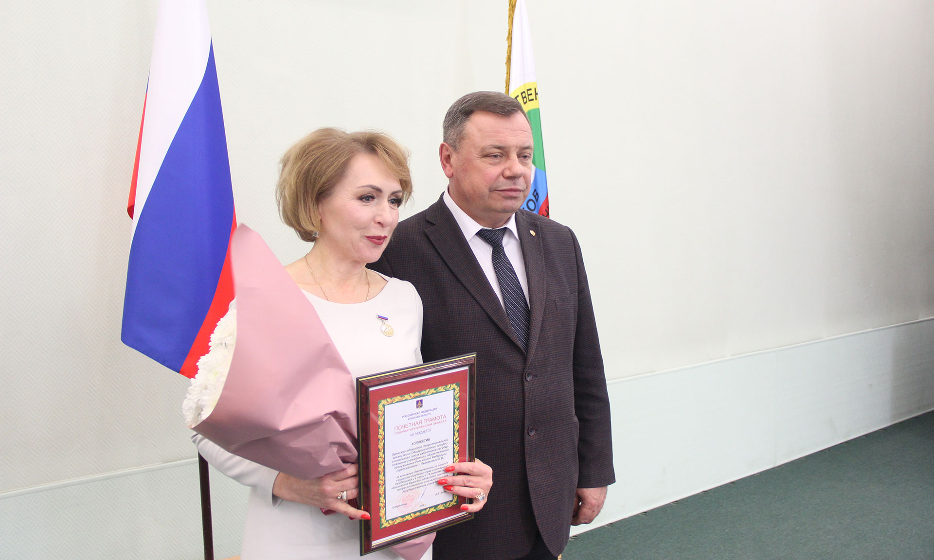 Владимир Оборотов вручил Почетные грамоты Губернатора Брянской области руководителю Брянской областной территориальной организации Общероссийского профсоюза работников государственных учреждений и общественного обслуживания Российской Федерации Наталье Павлюченко, медицинской сестре государственного бюджетного стационарного учреждения социального обслуживания населения Брянской области «Карачевский психоневрологический интернат», председателю первичной профсоюзной организации Валентине Новиковой, начальнику общего отдела ГКУ «Брянский пожарно-спасательный центр», члену профсоюзного Комитета Алексею Никитину, заместителю директора — начальнику отдела Государственного казенного учреждения Брянской области «Центр занятости населения города Брянска», члену профсоюзного Комитета Ирине Шведовой, председателю Почепской территориальной организации Профсоюза, ведущему специалисту отдела экономики и прогнозирования администрации Почепского района Галине Рожковской.
