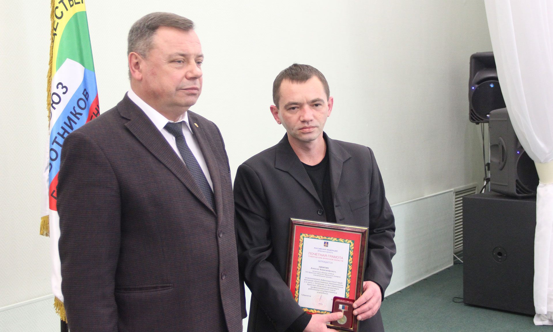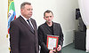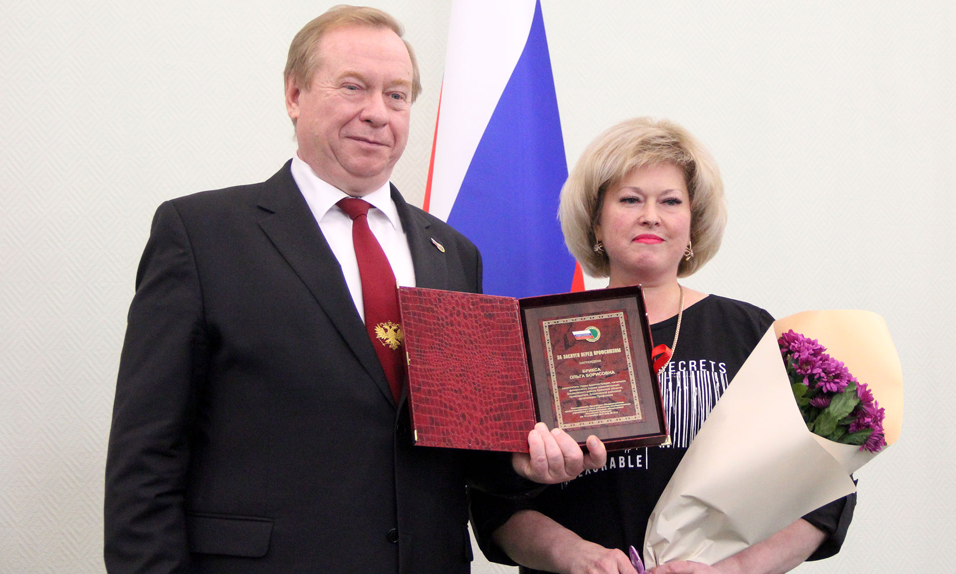 Почетным знаком «За заслуги перед Профсоюзом» Николай Водянов наградил члена Общероссийского Профсоюза работников государственных учреждений, главу администрации Брасовского района, председателя Совета муниципальных образований Брянской области Сергея Лавокина, заместителя главы администрации, начальника финансового отдела администрации Злынковского района Брянской области, председателя Злынковской районной организации Профсоюза работников государственных учреждений, председателя Координационного совета профсоюзов Злынковского района Ольгу Бриксу.