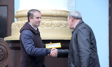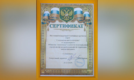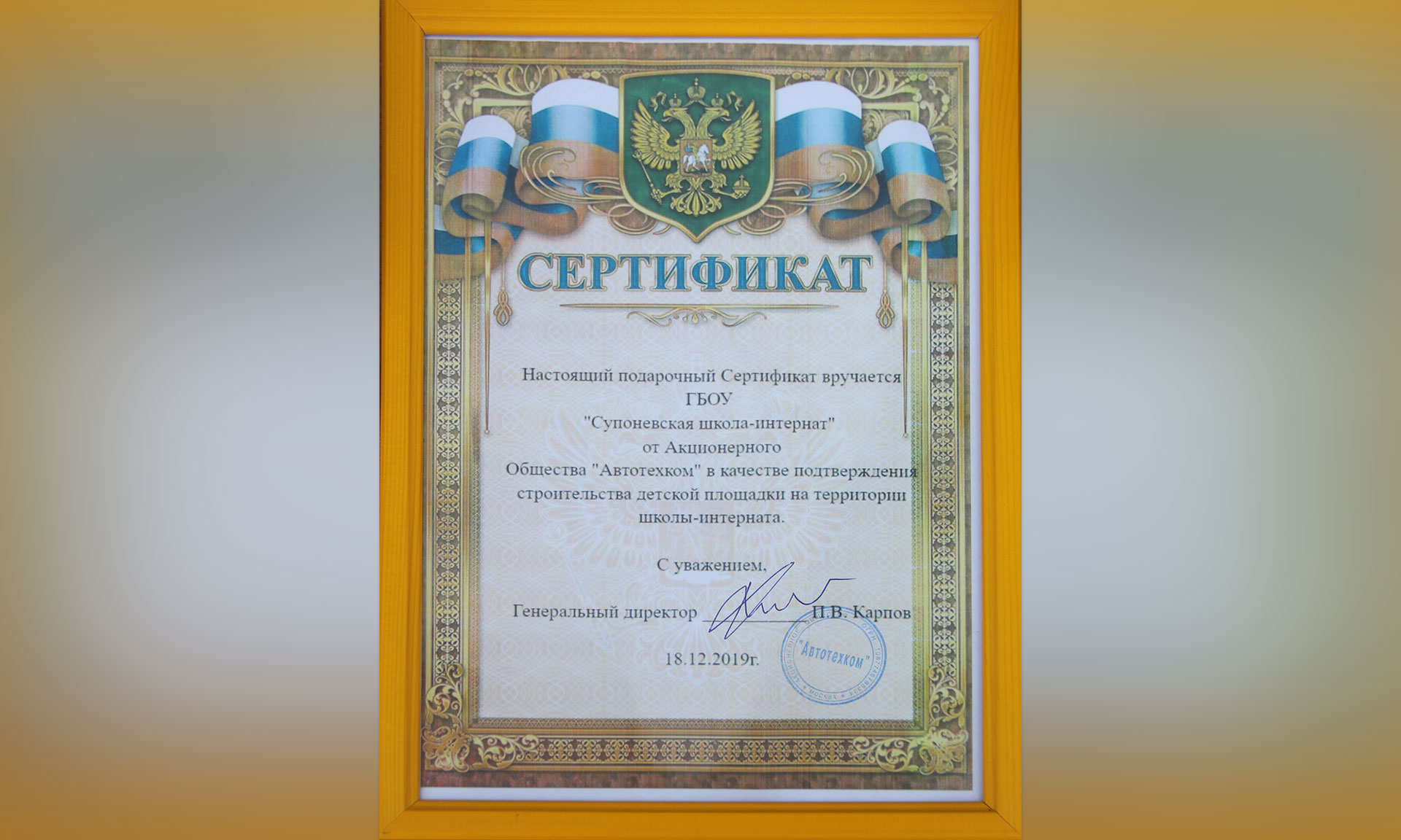 Он вручил подарочный Сертификат на детскую площадку «Супоневской школе-интернату». Получил сертификат директор Геннадий Марченко.