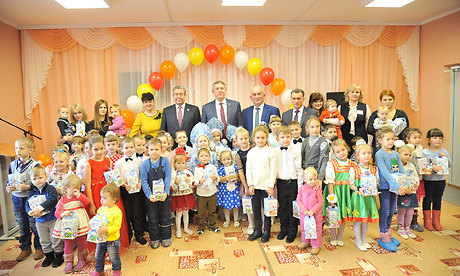 Александр Богомаз вручил заведующей детским садом «Аистенок» Наталье Пеньковой символический ключ, а абсолютно все малыши, которые присутствовали в зале вместе с родителями, получили от главы региона сладкие новогодние подарки.