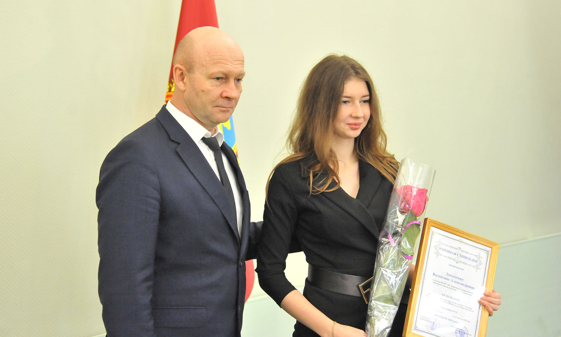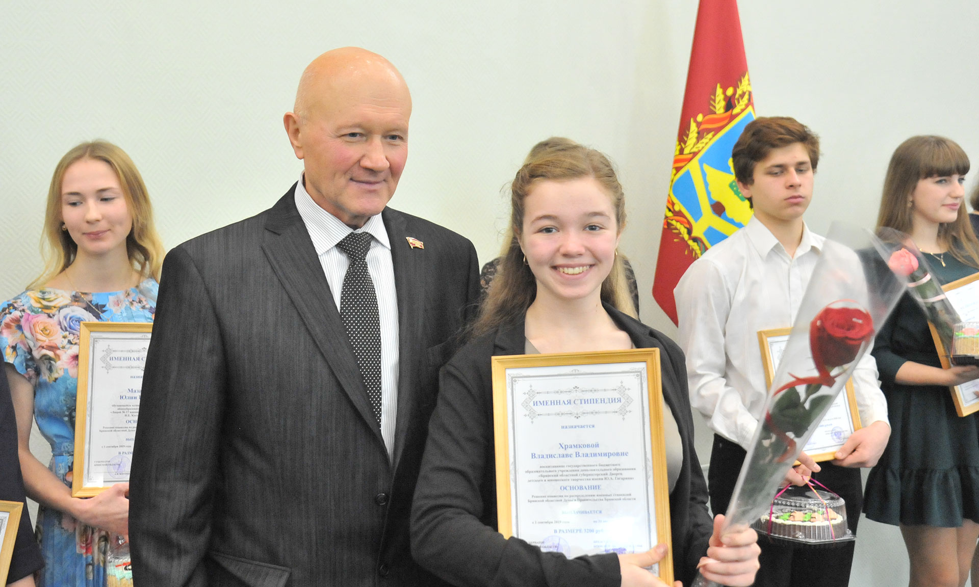 — Добрый день, дорогие друзья! Мы собрались в этом зале в связи со значительным событием в вашей жизни. Сегодня вы, самые одаренные и успешные молодые люди, получите свидетельства о назначении именных стипендий Брянской областной Думы, Правительства Брянской области, стипендии Правительства Брянской области имени Петра Лукича Проскурина и премии Губернатора Брянской области. Поздравляю вас!