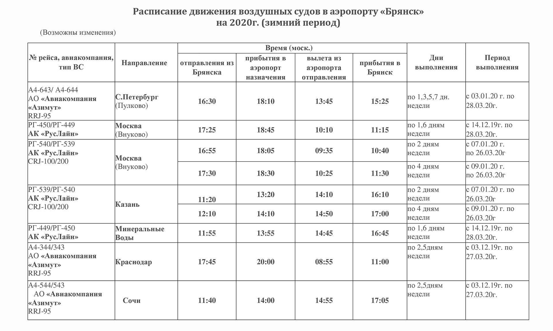 Продолжают открываться новые направления авиаперевозок из международного аэропорта «Брянск». Так, с 7 января 2020 года авиакомпания «РусЛайн», один из лидеров региональных перевозок России, приступила к выполнению регулярных перелетов между Брянском и Казанью. Данное авиасообщение планируется сделать круглогодичным.