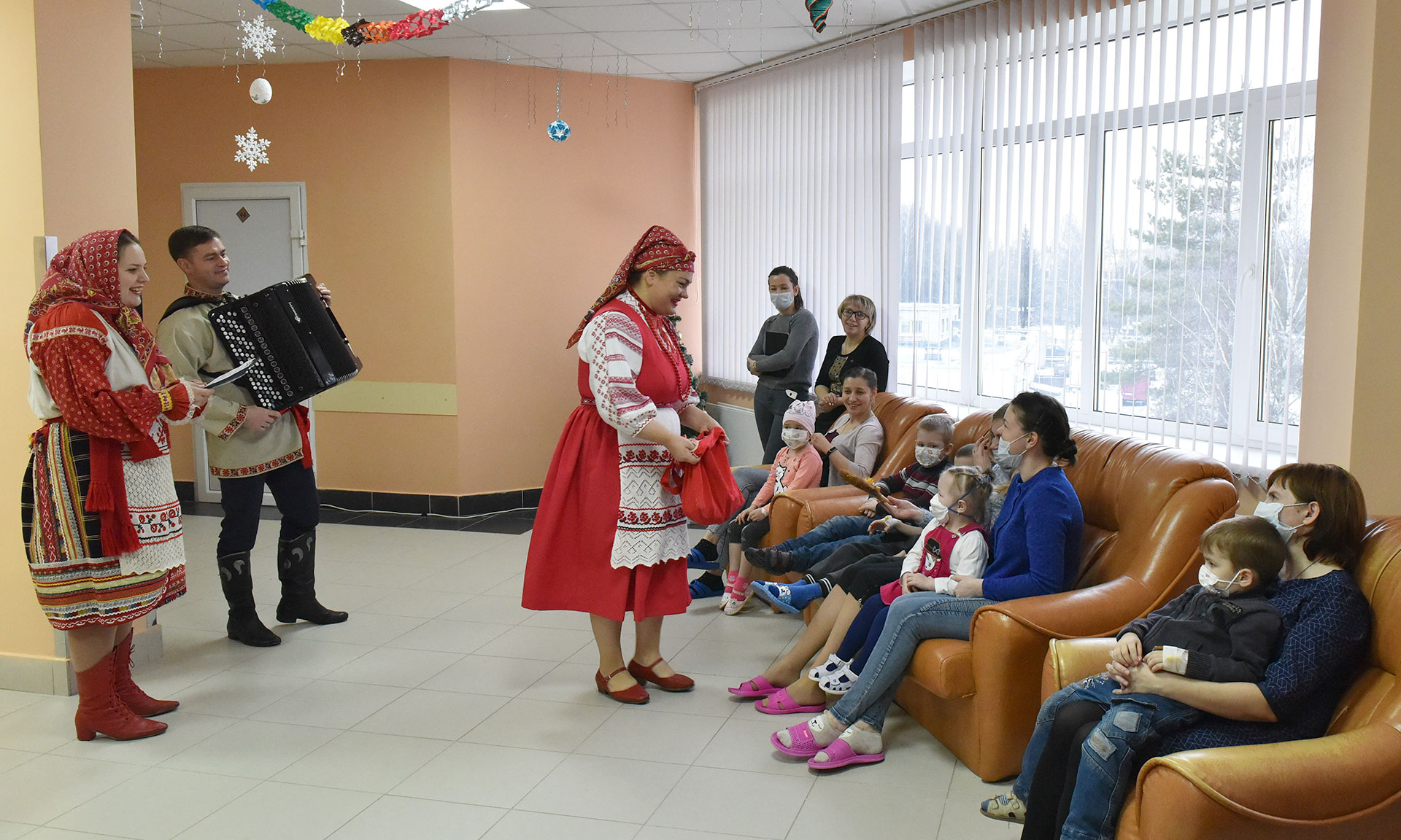 В исполнении ансамбля прозвучали календарные обрядовые песни и пожелания. Маленьких пациентов ждали зимние загадки и игры.