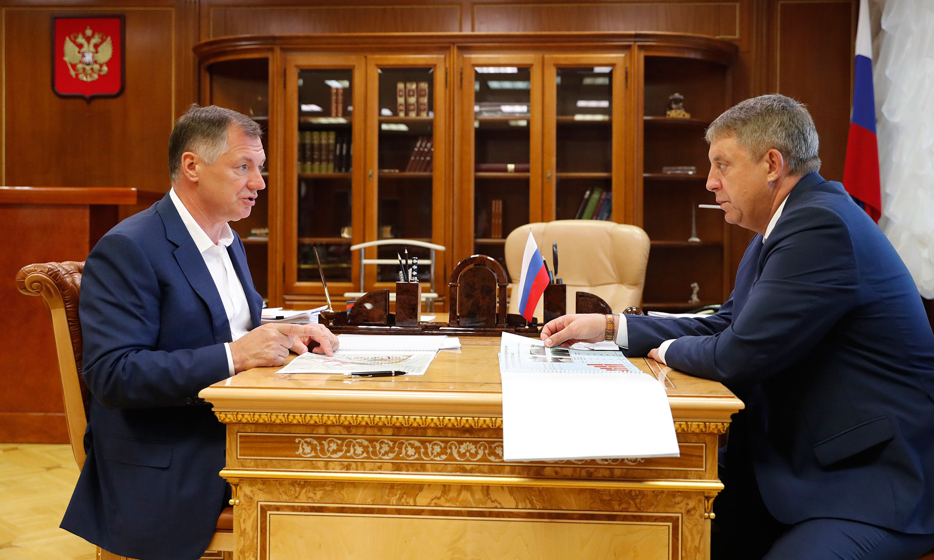2 июля в Доме Правительства состоялась рабочая встреча Заместителя Председателя Правительства Российской Федерации Марата Хуснуллина и Губернатора Брянской области Александра Богомаза. В ходе встречи Марат Хуснуллин высоко оценил работу руководства региона в части дорожного строительства.