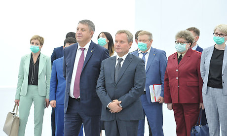 Денис Мантуров и Александр Богомаз в сопровождении генерального директора ФГУП «Московский эндокринный завод» Михаила Фонарева посетили цех по производству медицинских масок. В производстве используются качественные материалы, прошедшие все необходимые сертификации и проверки.