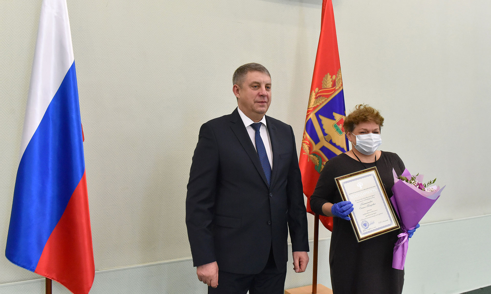 За сохранение и развитие культуры Брянской области, преданность профессии и в связи с Днем работника культуры Благодарностью главного федерального инспектора по Брянской области награждены Николай Яшутин — преподаватель Рогнединской детской школы искусств, Михаил Романенко — художественный руководитель Первомайского структурного подразделения Межпоселенческого центра культурно-досуговой работы Клинцовского района, Валентина Бородина — директор Дубровской детской школы искусств, Наталья Ковтунова — художественный руководитель Петрово-Будского сельского Дома культуры Гордеевского района.