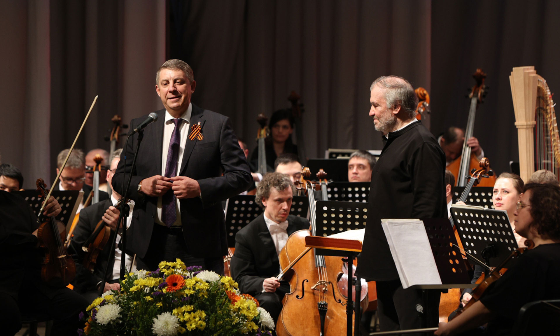 — Уважаемый Валерий Абисалович! Я рад приветствовать Вас и симфонический оркестр Мариинского театра на нашей гостеприимной и героической Брянской земле! Сегодня здесь, в этом зале, Вы подарили нам большой праздник, эти минуты радости.