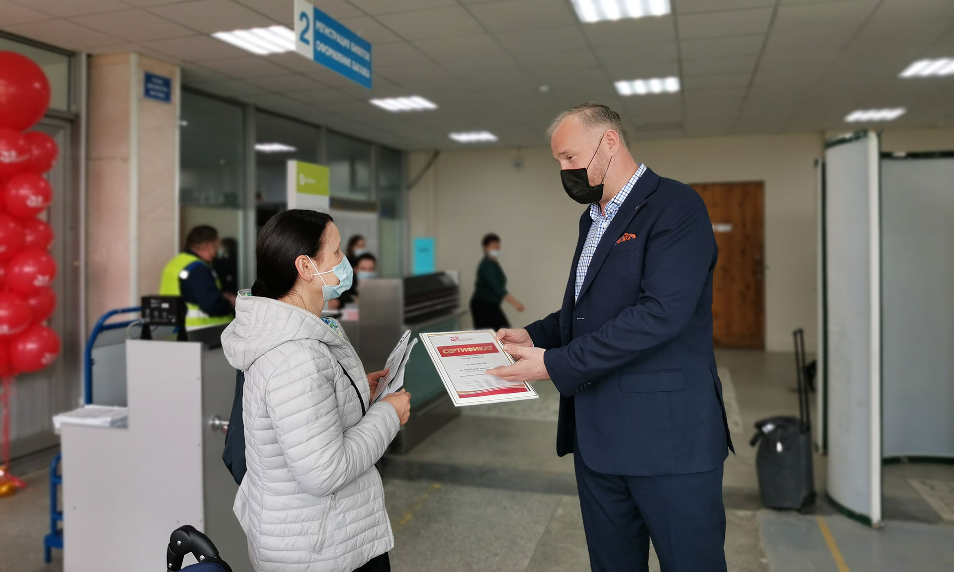 Представитель авиакомпании вручил пассажиру, первым купившему билет на рейс, сертификат на двоих на бесплатный перелет туда и обратно авиакомпанией «РусЛайн» в любом направлении.