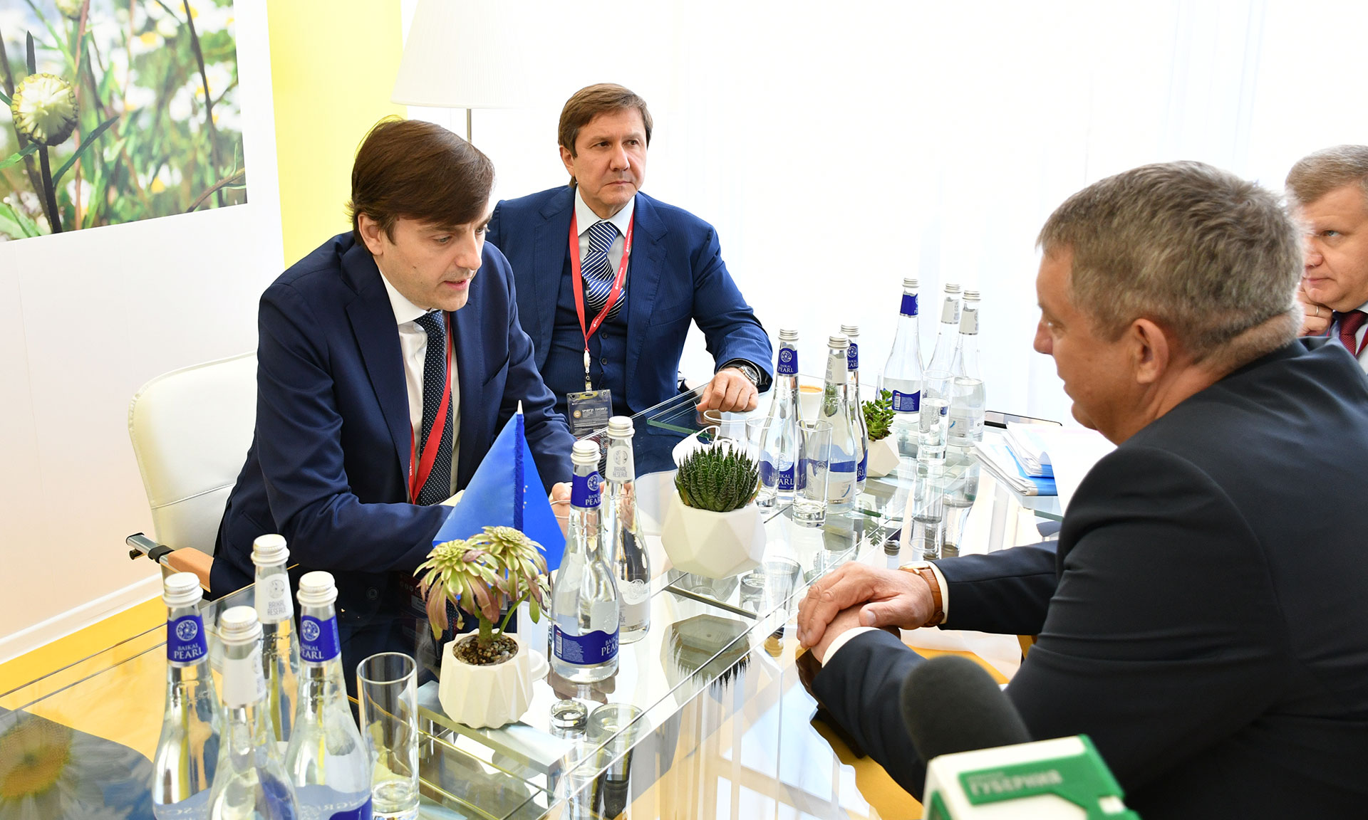 На полях ПМЭФ-2021 состоялась рабочая встреча Министра просвещения Российской Федерации Сергея Кравцова и Губернатора Брянской области Александра Богомаза.